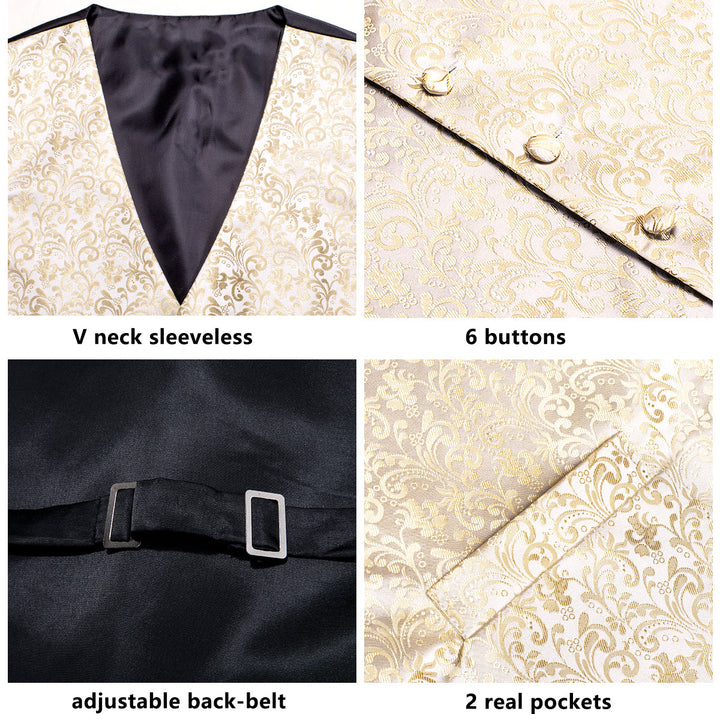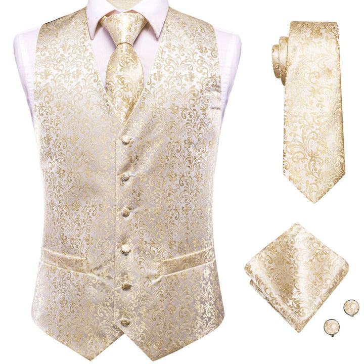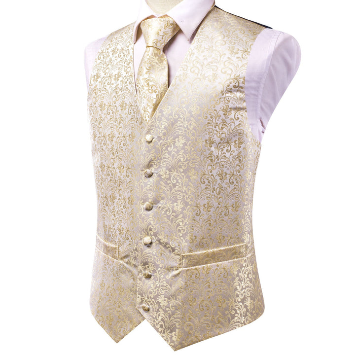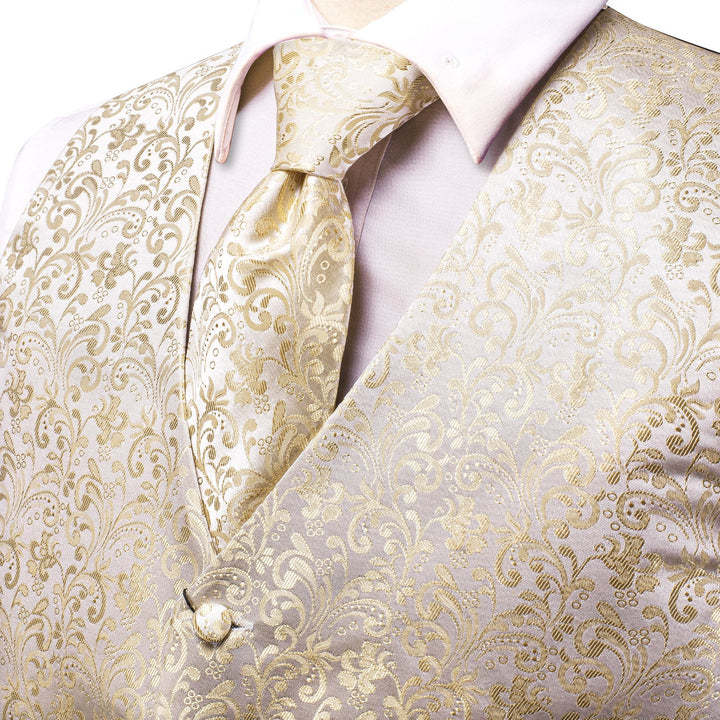 Champagne Beige Floral Jacquard Silk Men's Vest Hanky Cufflinks Tie Set