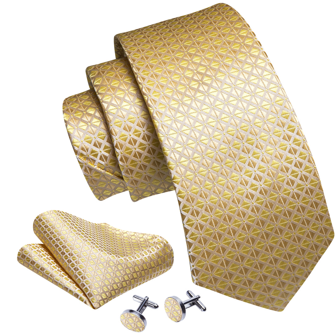Champagne Tie Golden Plaid Silk Men's Tie Hanky Cufflinks Set