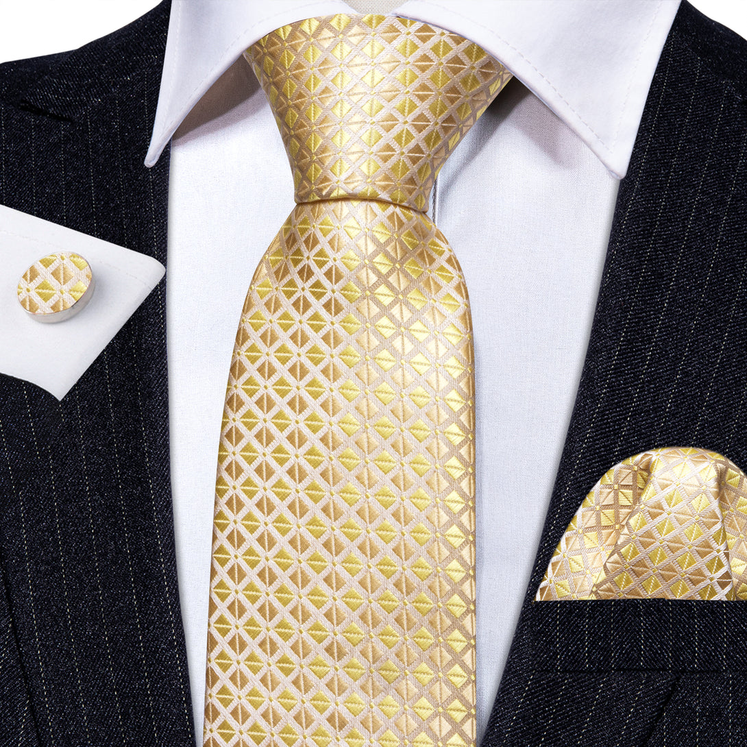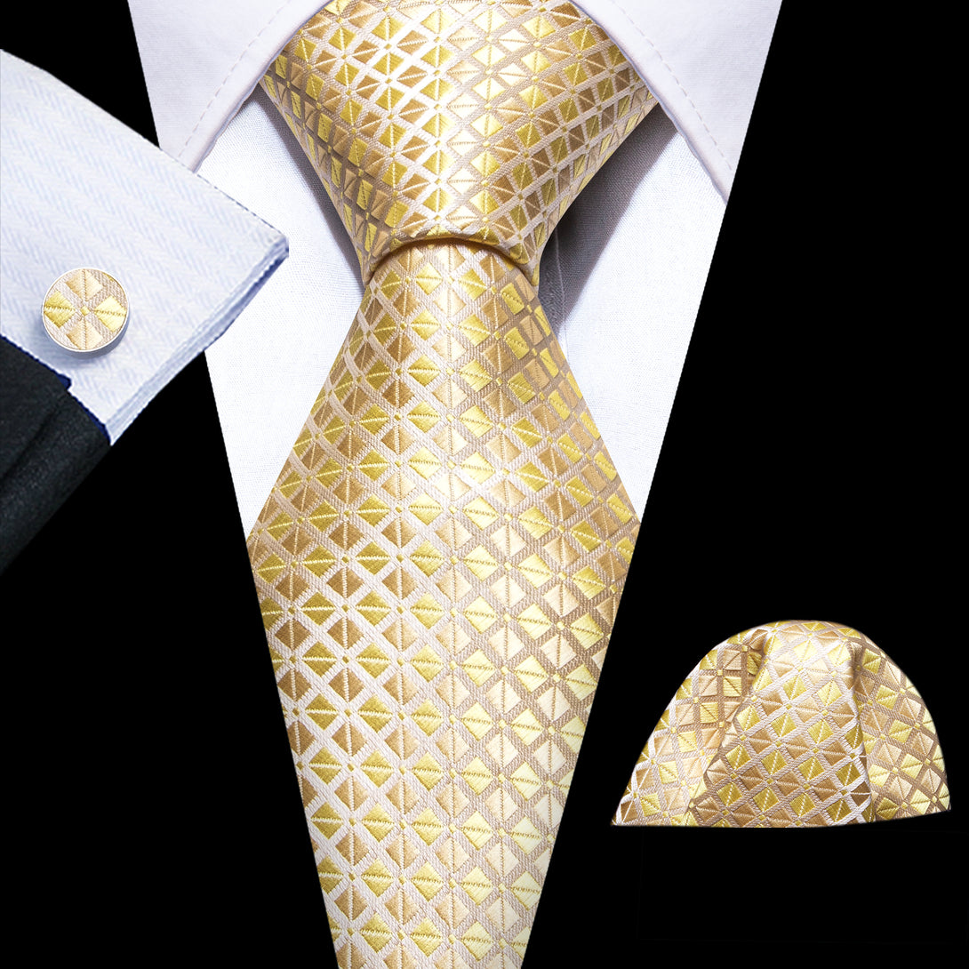 Ties2you Champagne Tie Golden Plaid Silk Men's Tie Hanky Cufflinks Set