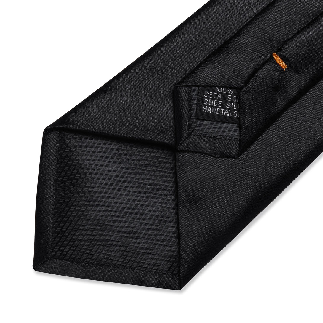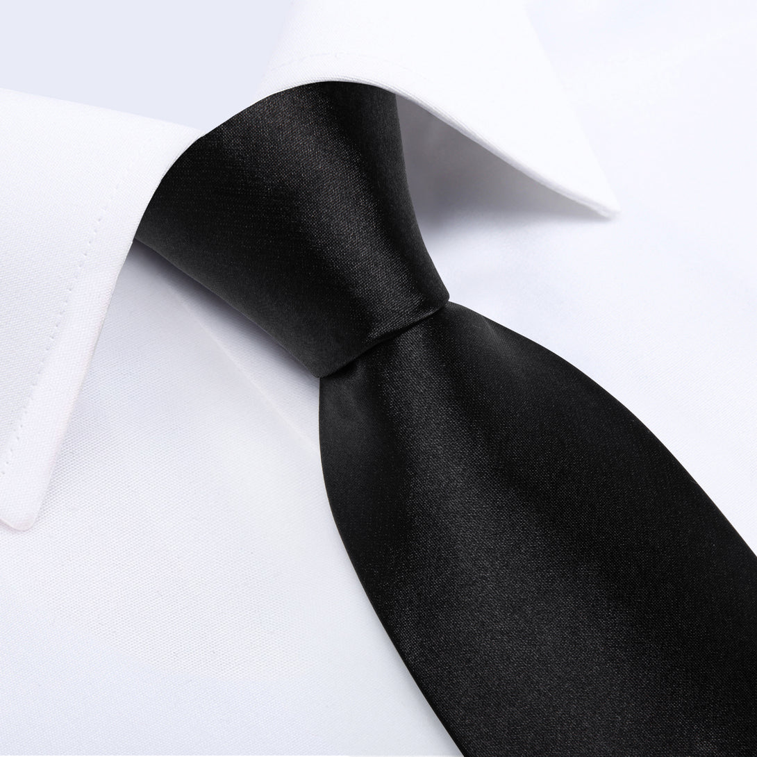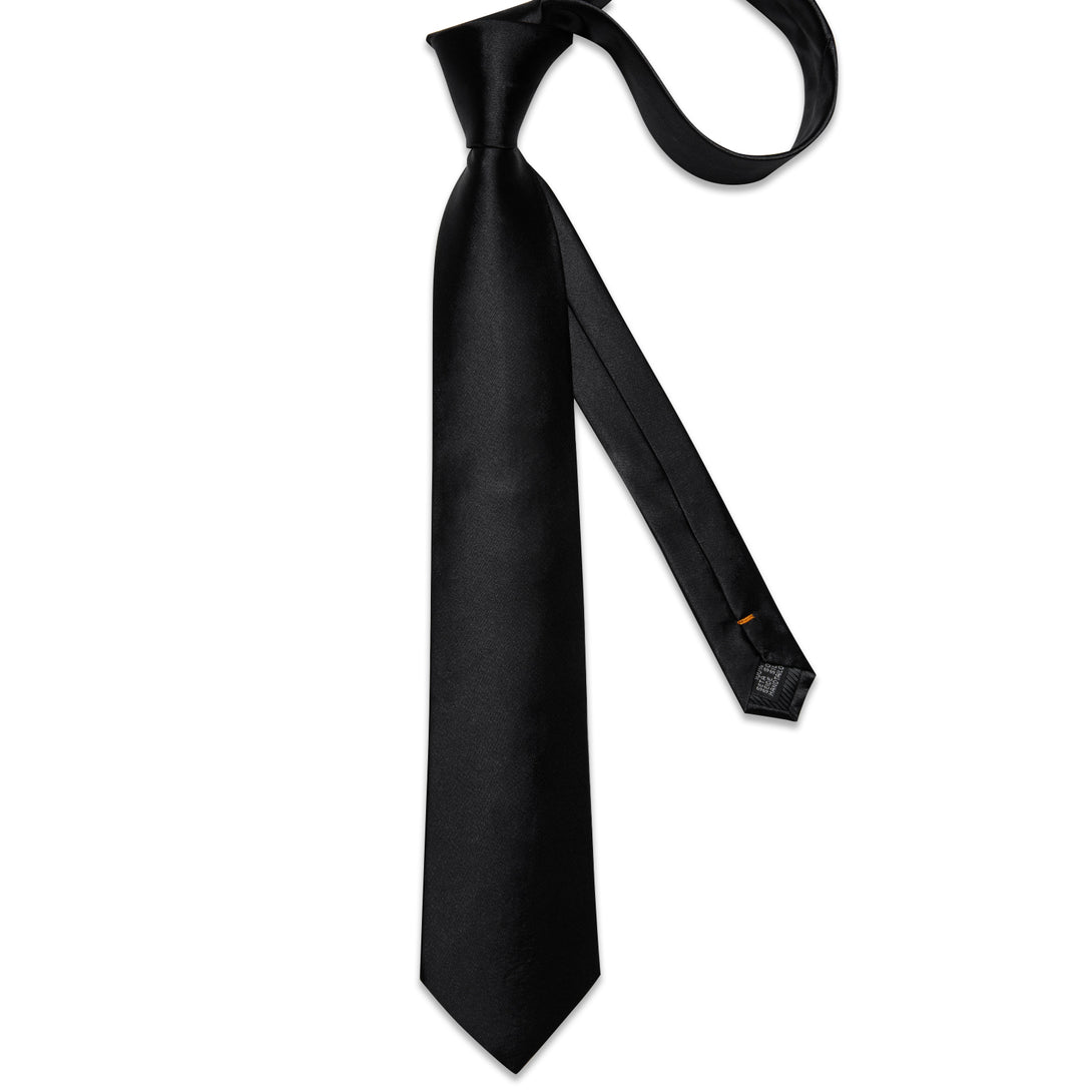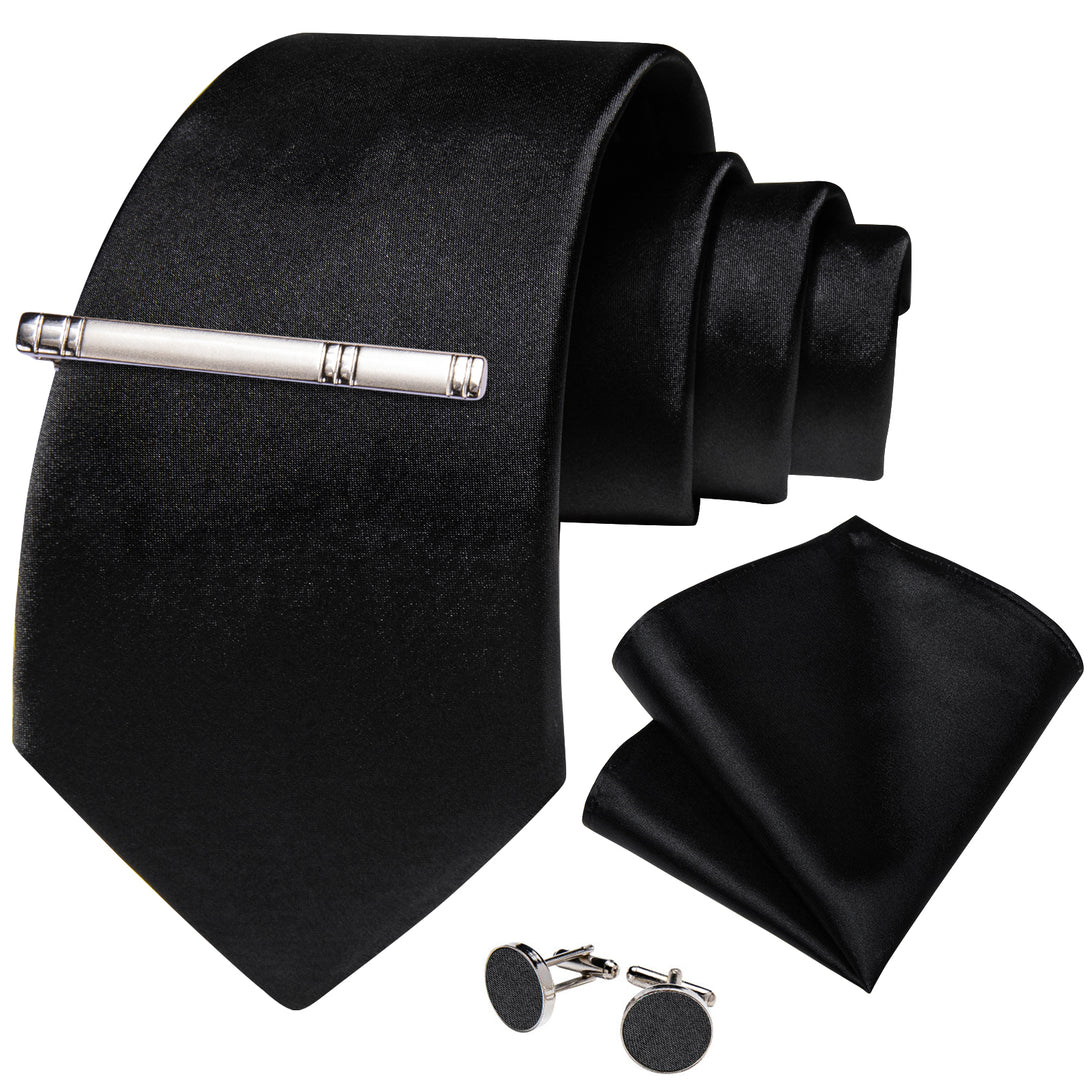 Classic Black Solid Silk Tie Pocket Square Cufflinks Set with Tie Clip