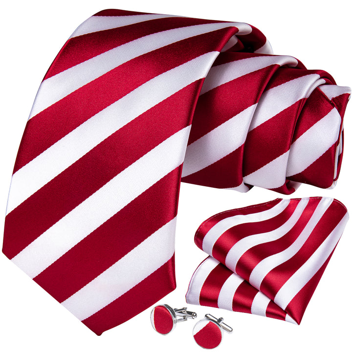 Classic White Red Striped Men's Necktie Pocket Square Cufflinks Set with Lapel Pin