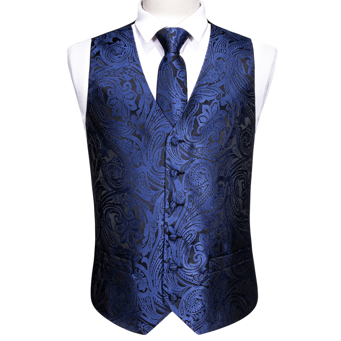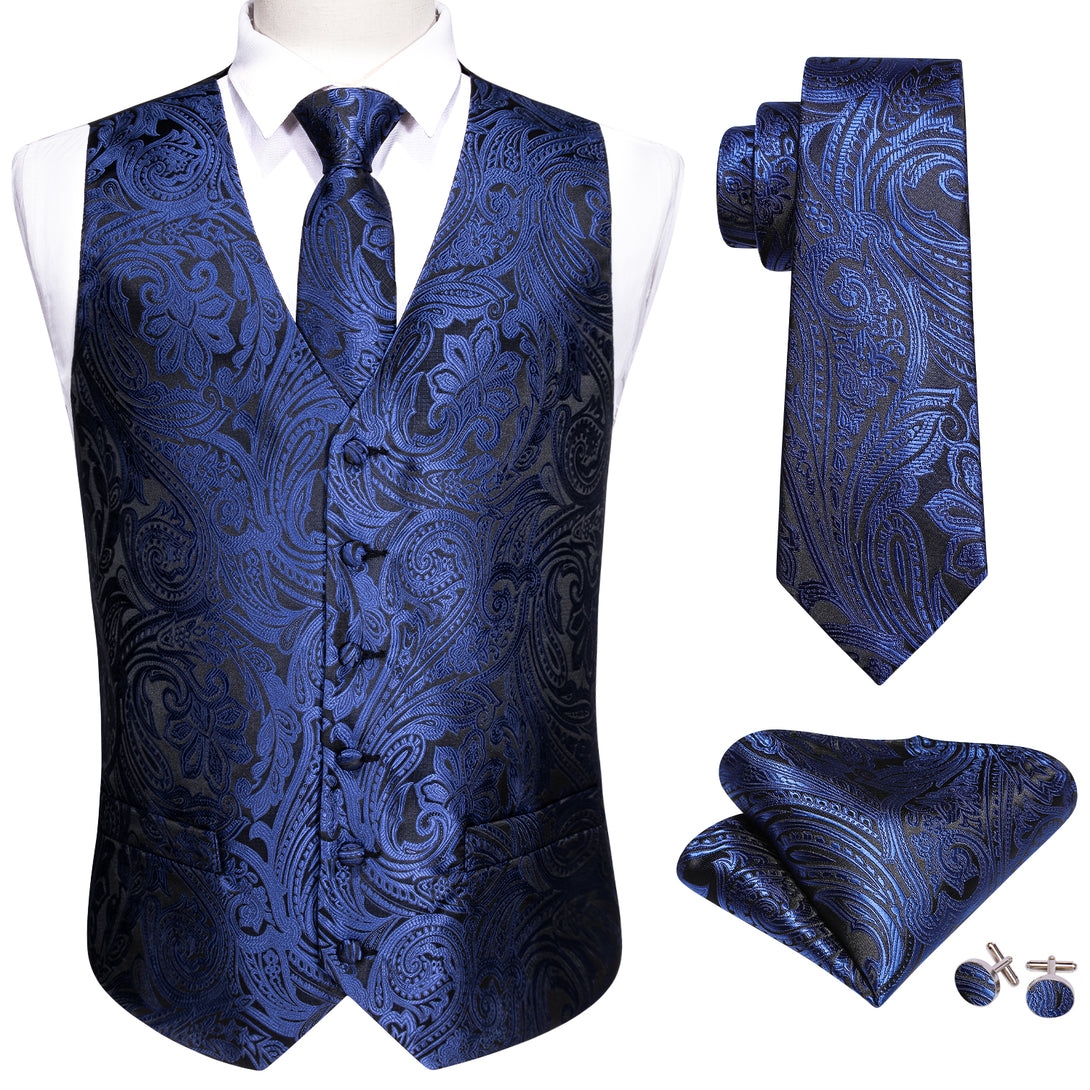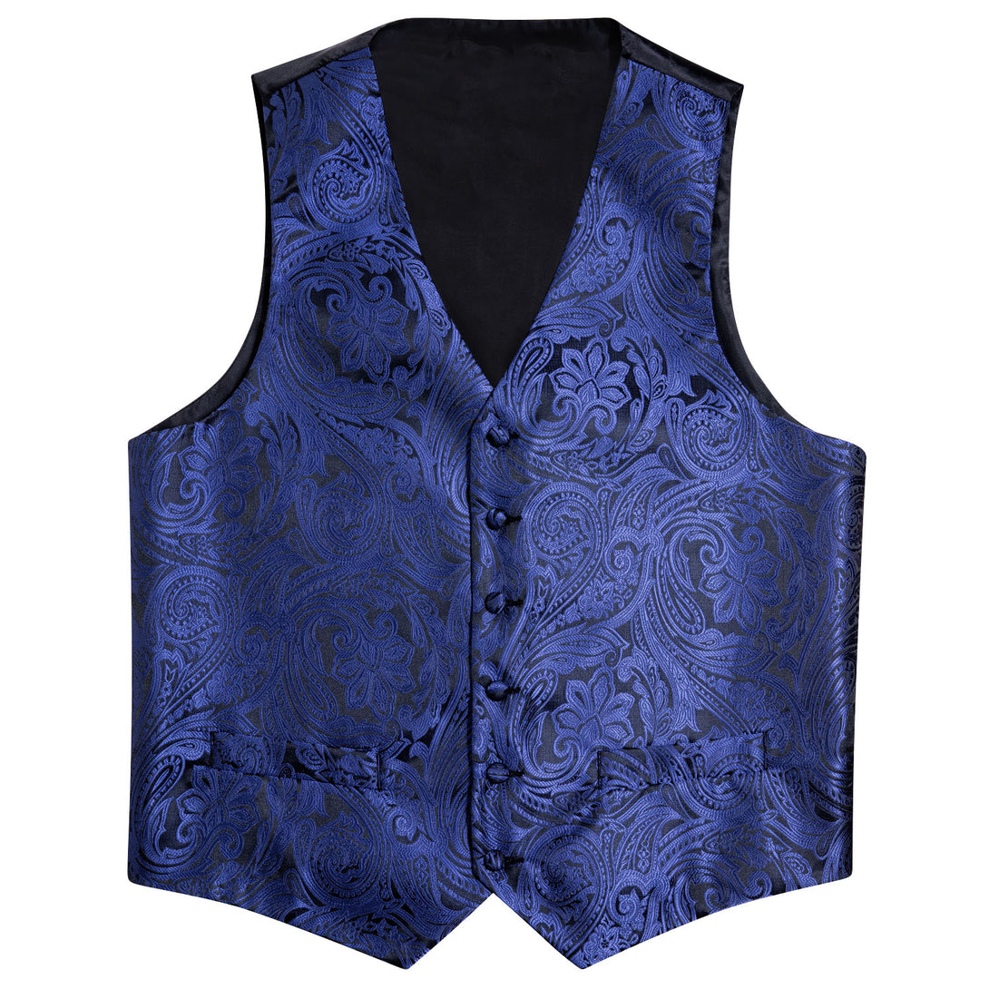 Deep Blue Paisley Jacquard Silk Men's Vest Hanky Cufflinks Tie Set