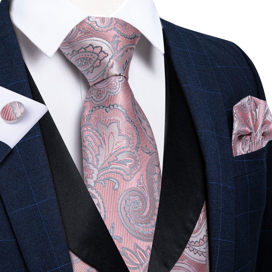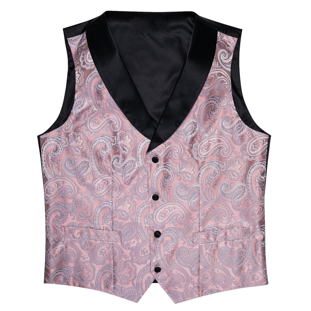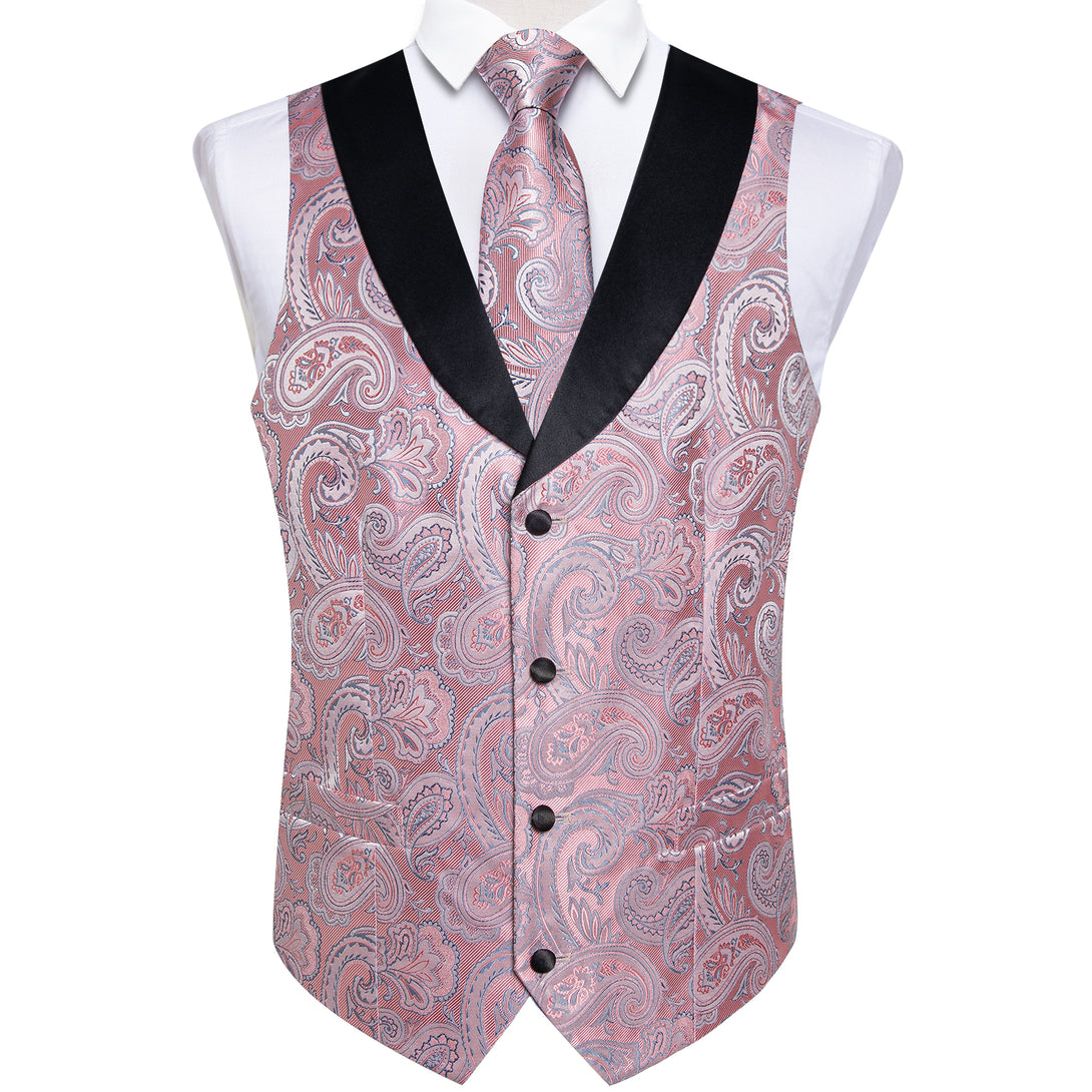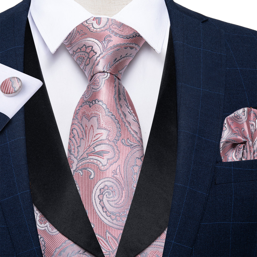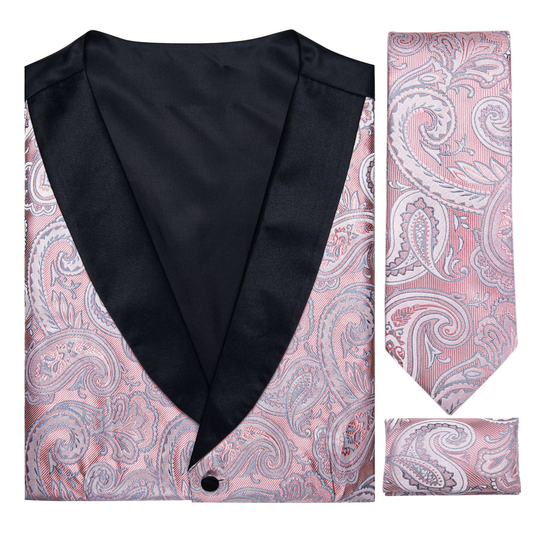 Fashion Black Collar Pink Paisley Jacquard Silk Men's Vest Hanky Cufflinks Tie Set