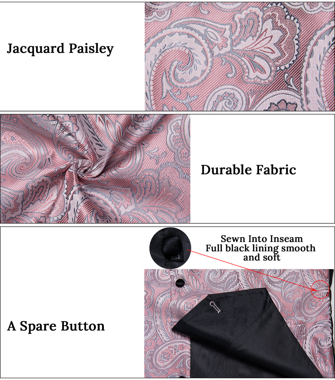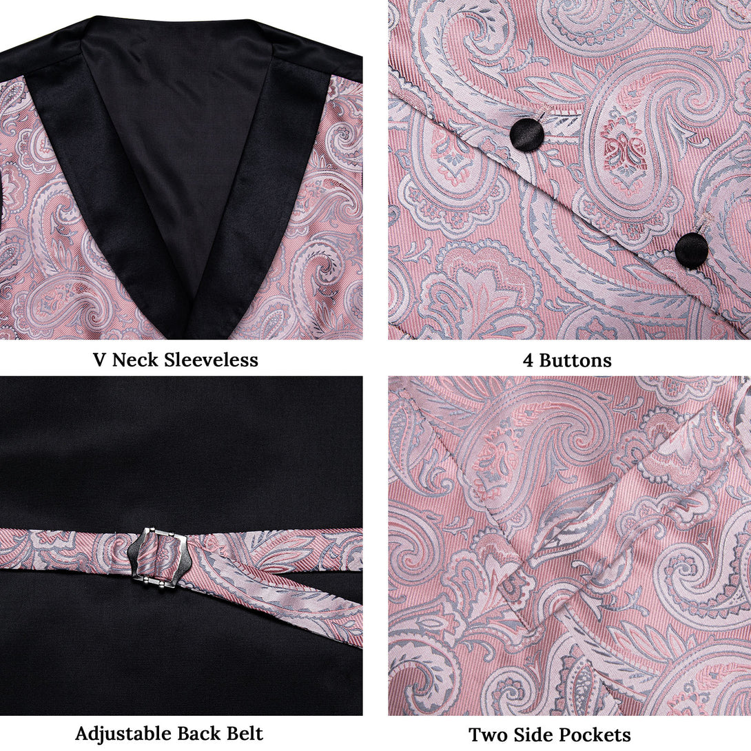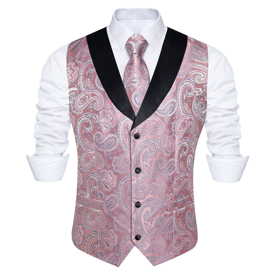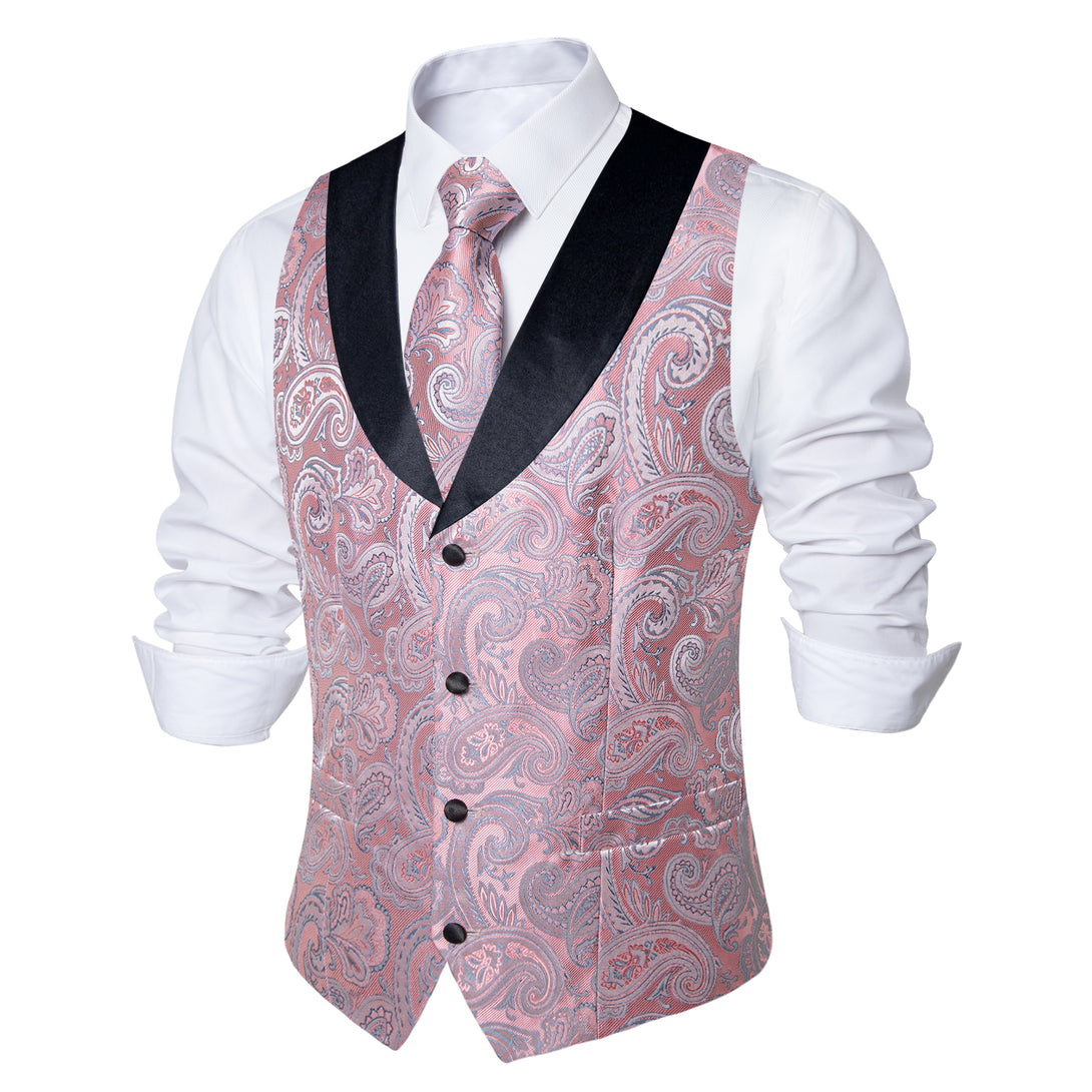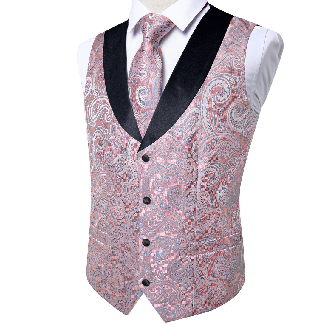 Fashion Black Collar Pink Paisley Jacquard Silk Men's Vest Hanky Cufflinks Tie Set
