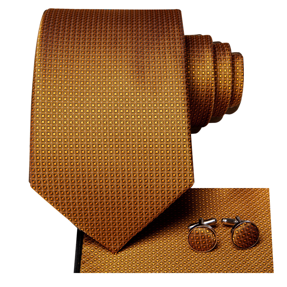 Ties2you Silk Gold Necktie Plaid Formal Tie Handkerchief Cufflinks Set for Men