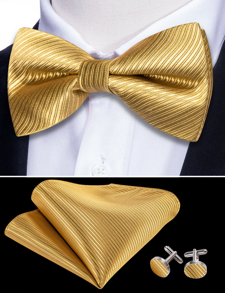 Golden Striped Pre-tied Bow Tie Hanky Cufflinks Set