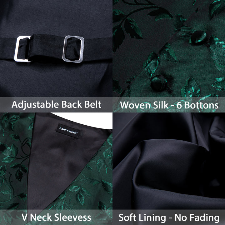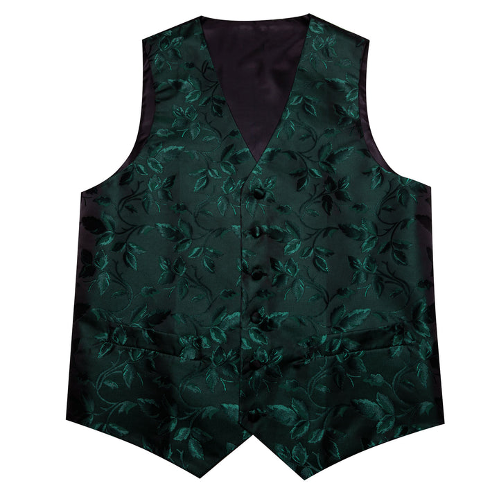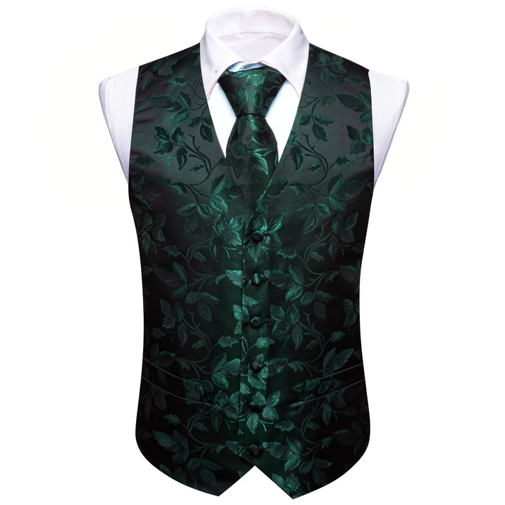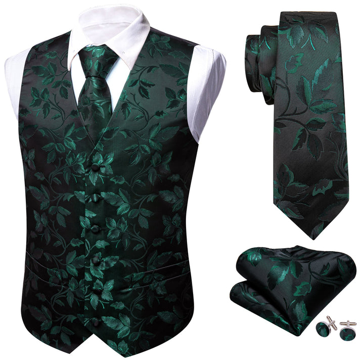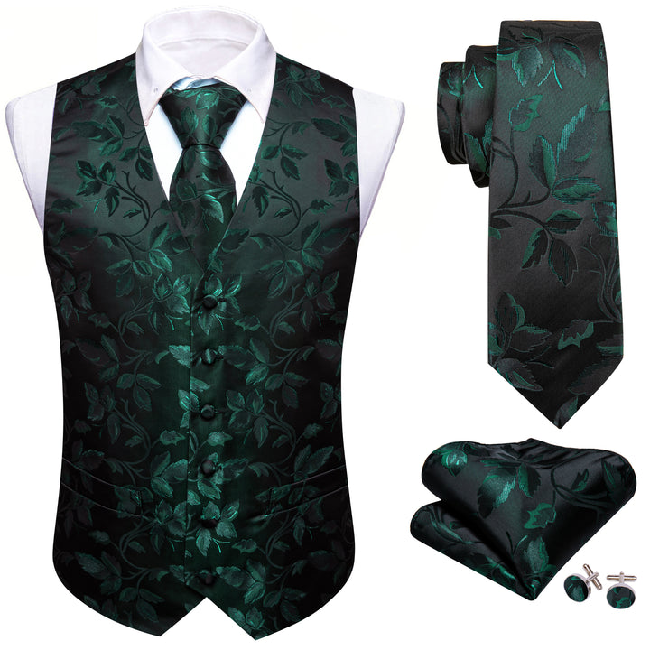 Green Black Floral Leaf Silk Men's Vest Hanky Cufflinks Tie Set