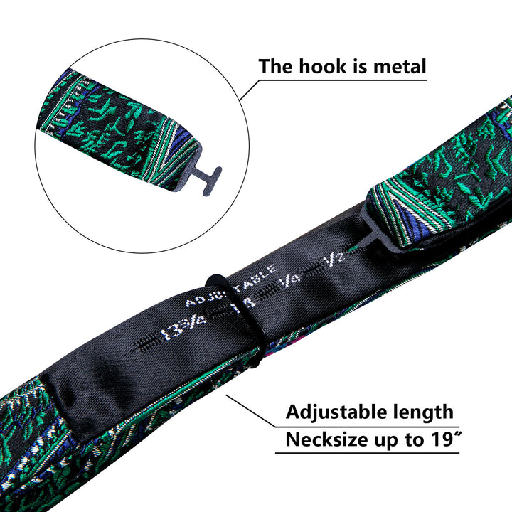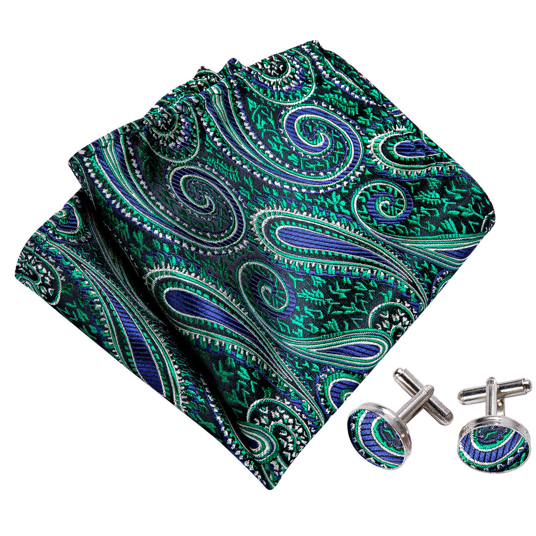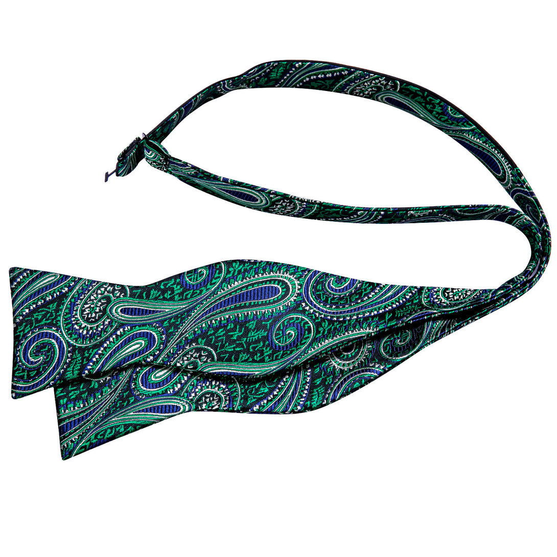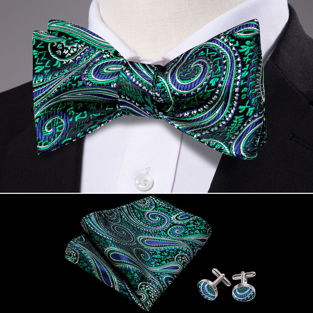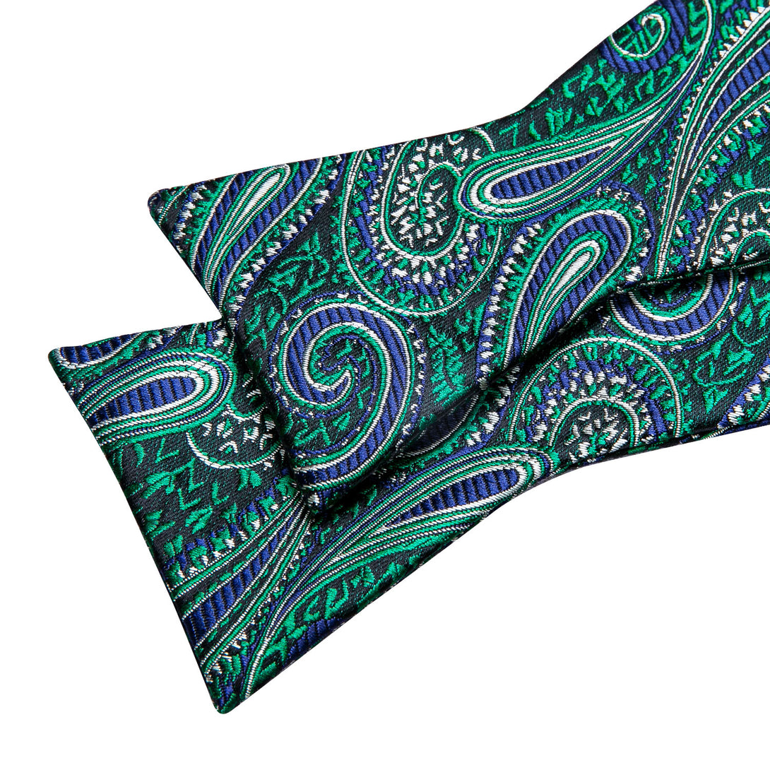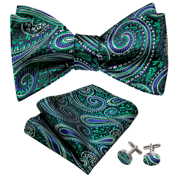 Green Blue Paisley Self-tied Silk Bow Tie Pocket Square Cufflinks Set