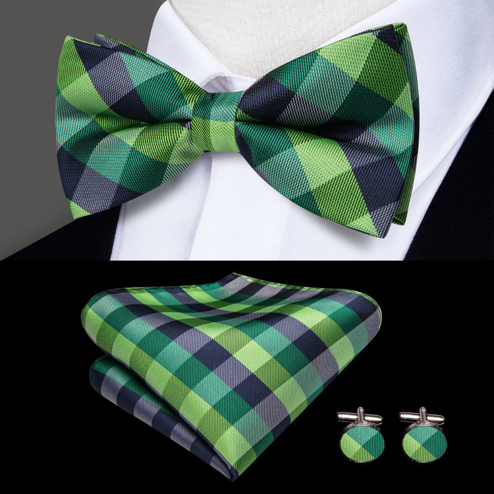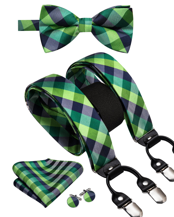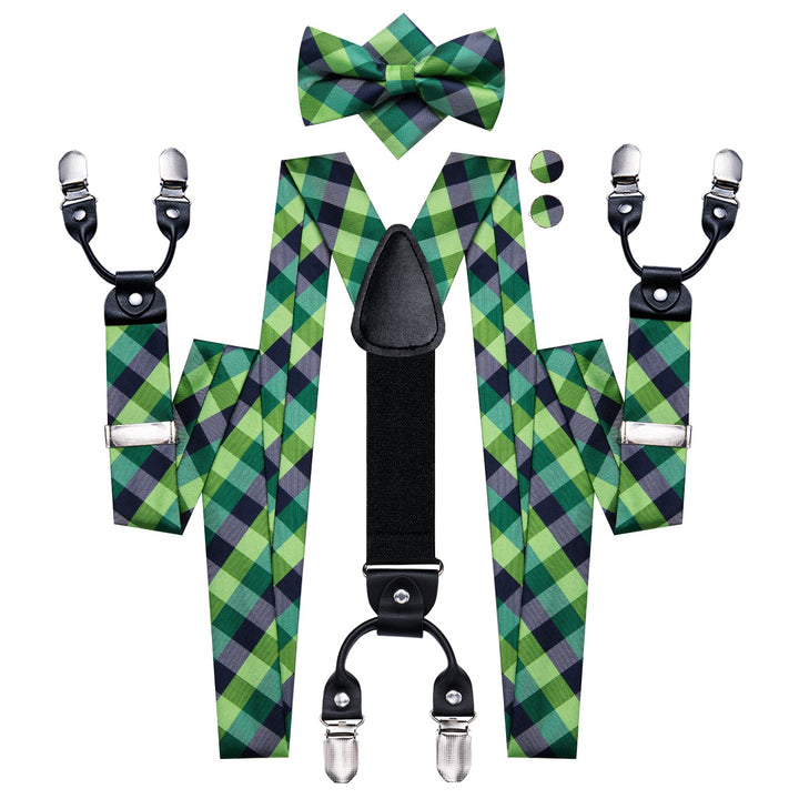 Green Blue Plaid Y Back Brace Clip-on Men's Suspender with Bow Tie Set