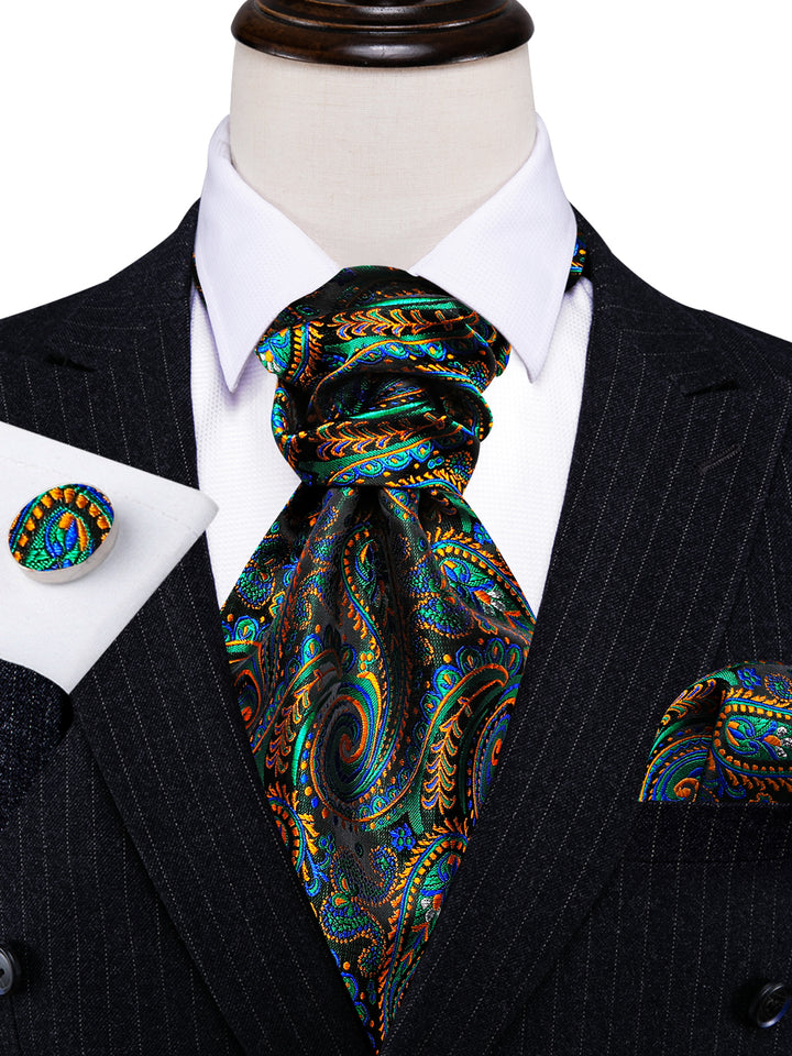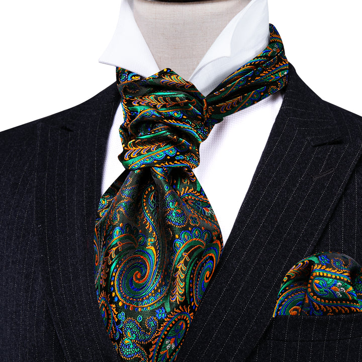 Green Orange Paisley Silk Cravat Woven Ascot Tie Pocket Square Cufflinks Set