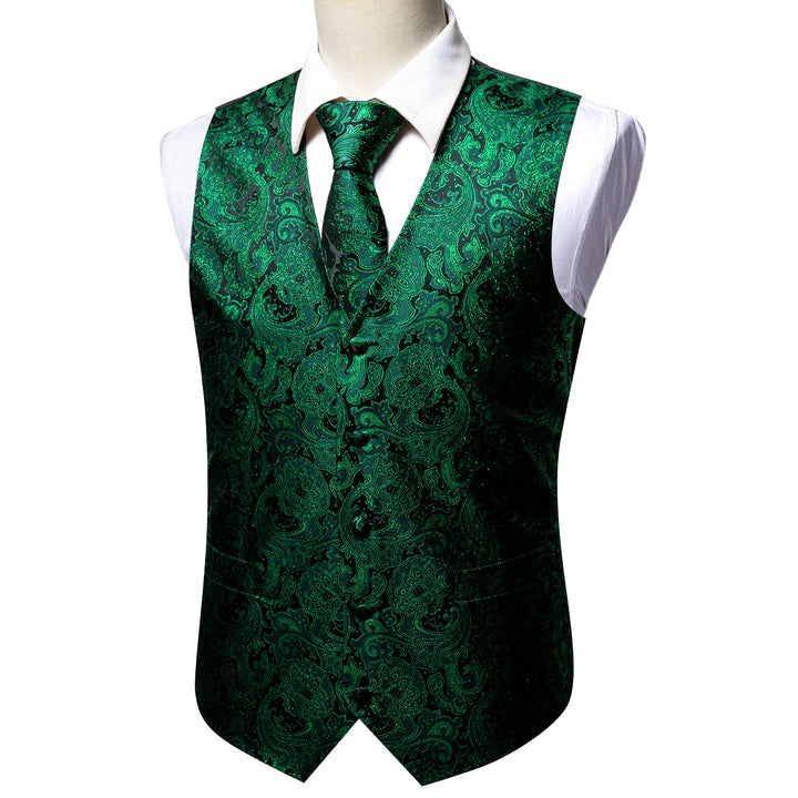 Green Paisley Jacquard Silk Men's Vest Hanky Cufflinks Tie Set