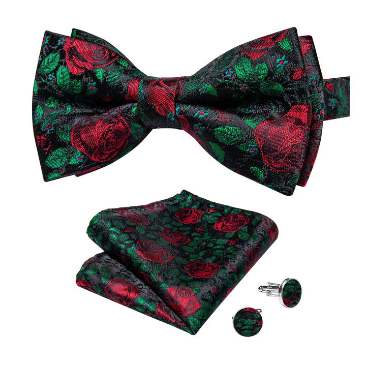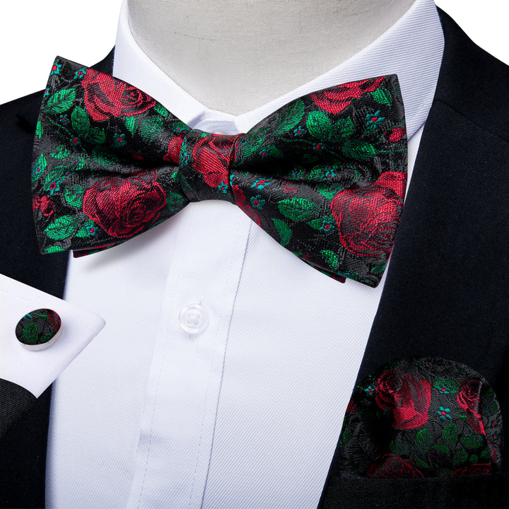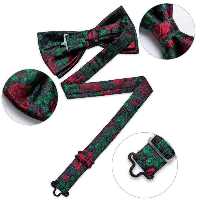 Ties2you Floral Red Rose Bowtie Pre-tied Green Bow Tie Handkerchief Cufflinks Set