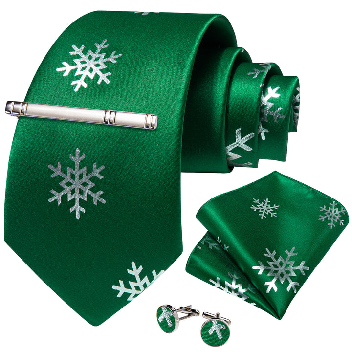Green Sliver SnowFlake Novelty Silk Men's Necktie Pocket Square Cufflinks Set with Clip