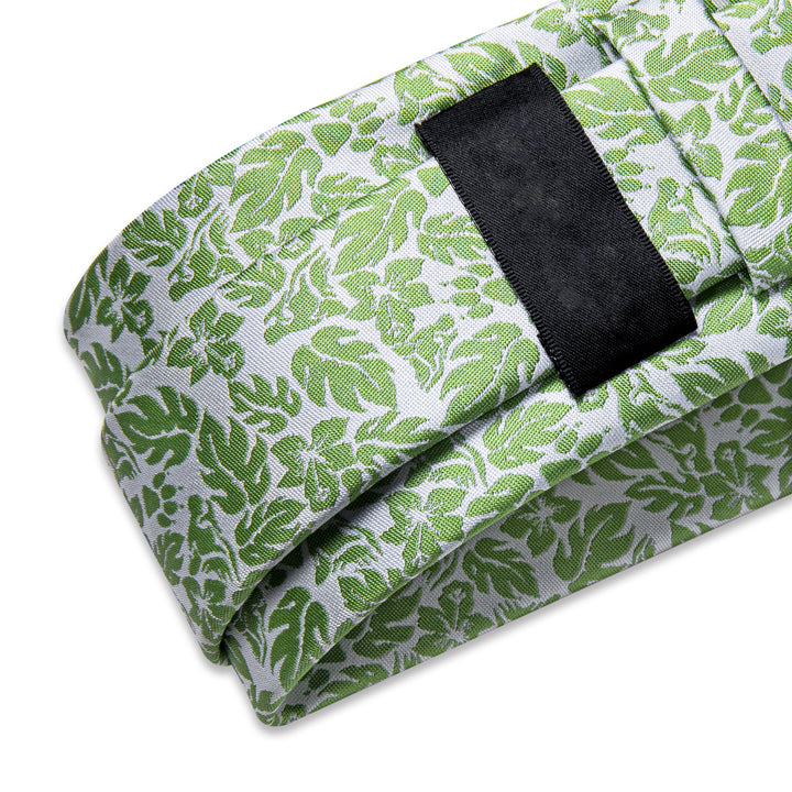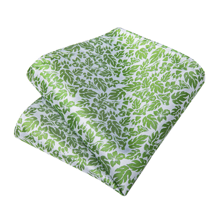 Green White Floral Leaf Silk Men's Necktie Pocket Square Cufflinks Set with Clip