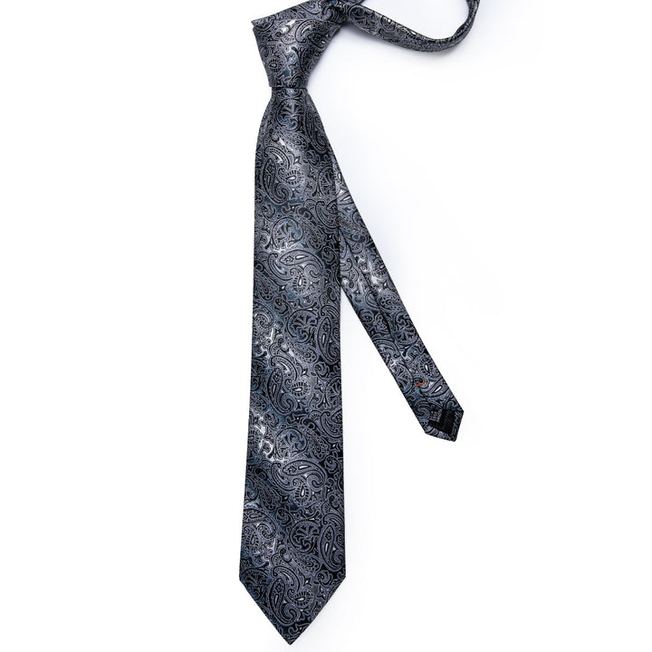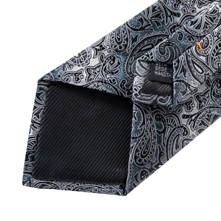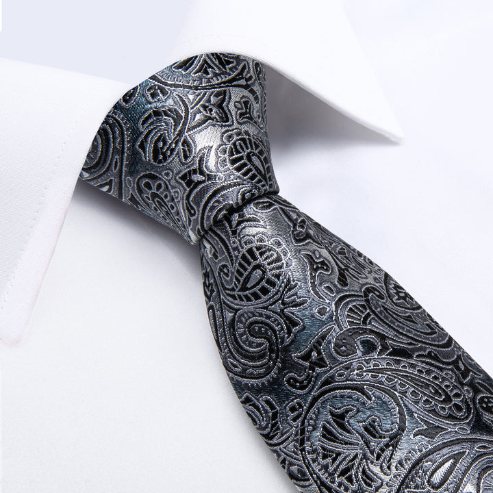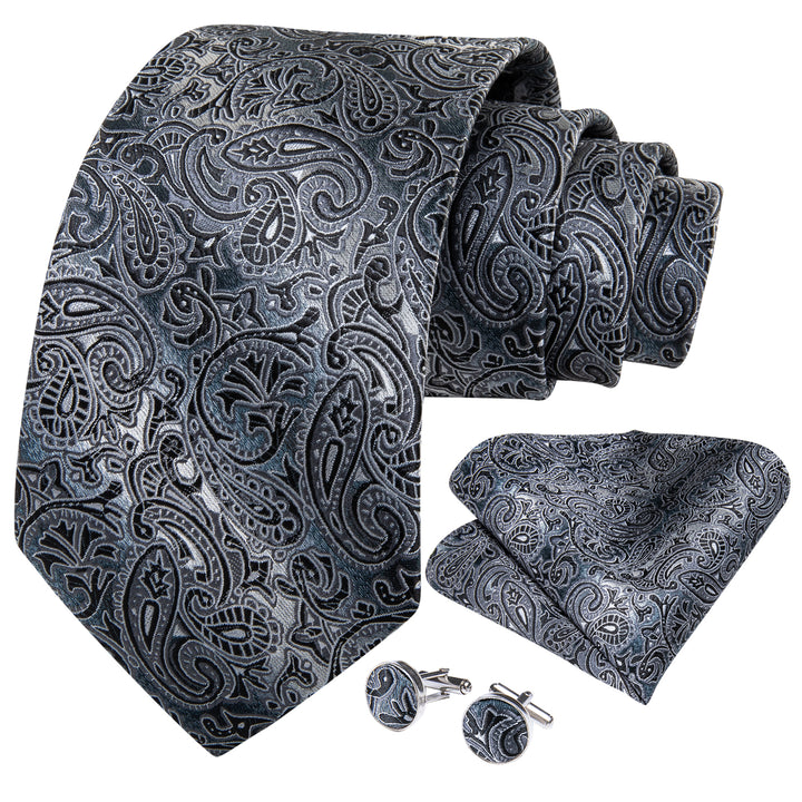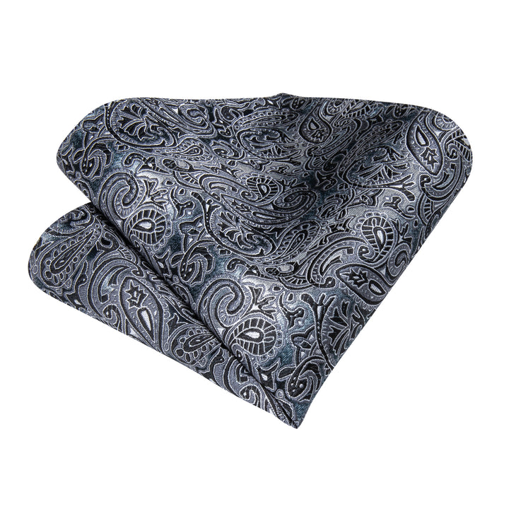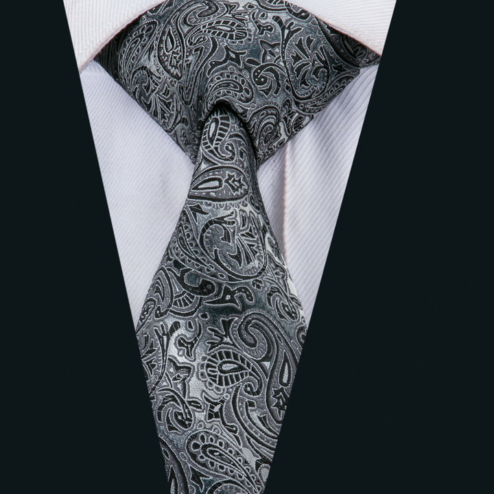Grey Black Paisley Tie Pocket Square Cufflinks Set