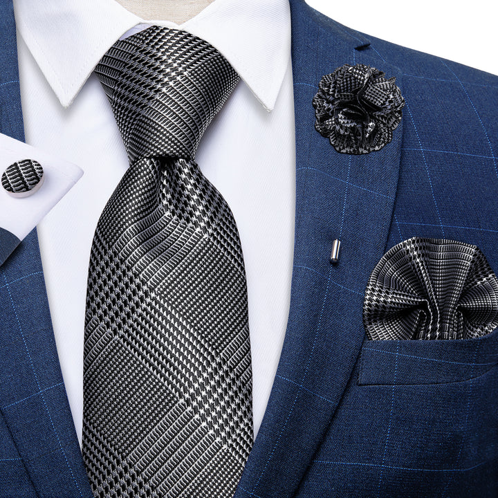 Grey Black White Plaid Novelty Woven Men's Necktie Pocket Square Cufflinks Set with Lapel Pin