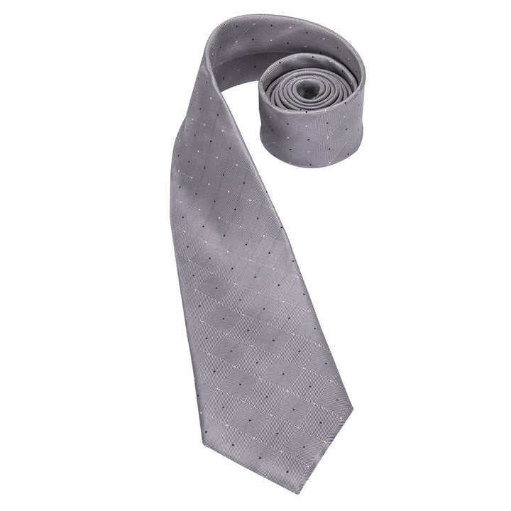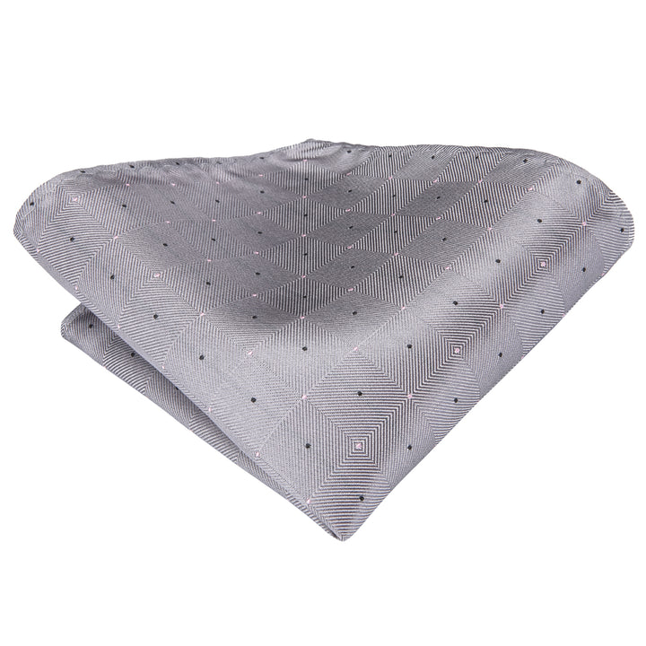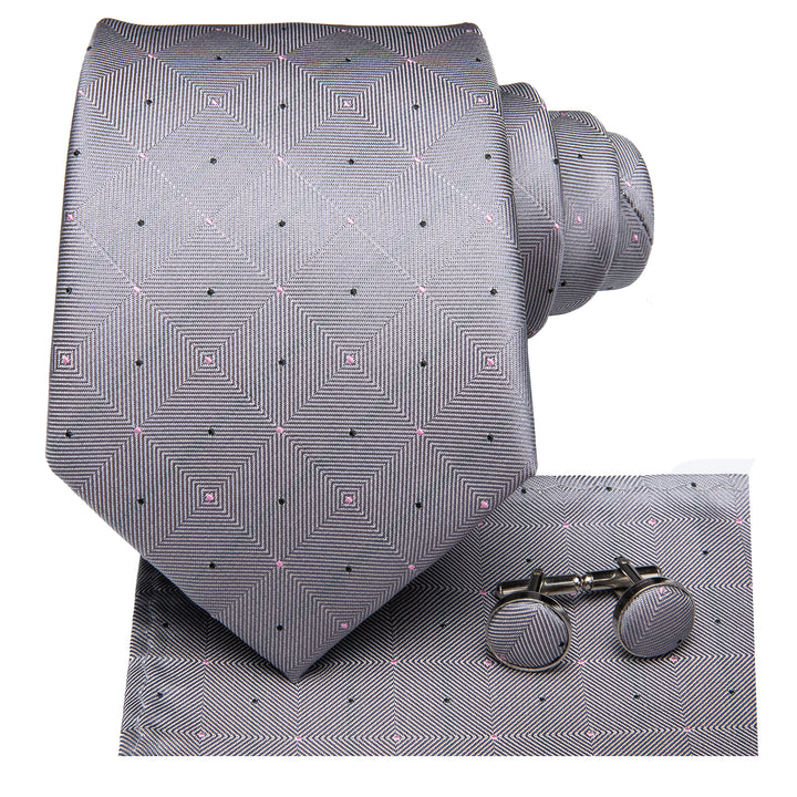 Grey Plaid with Black Pink Dot Silk Men's Tie Handkerchief Cufflinks Set