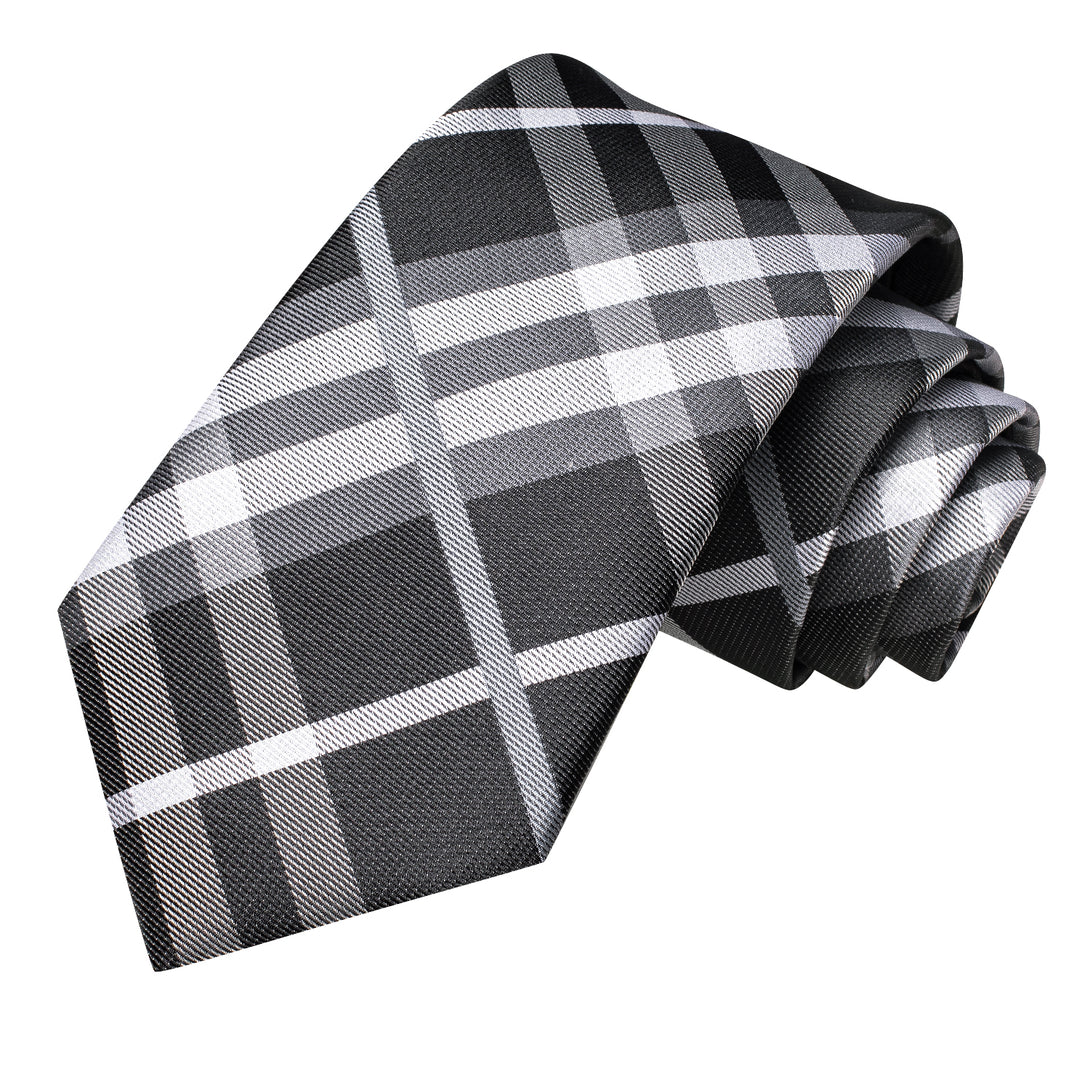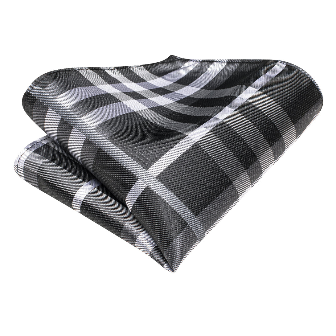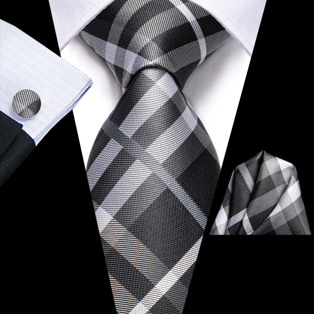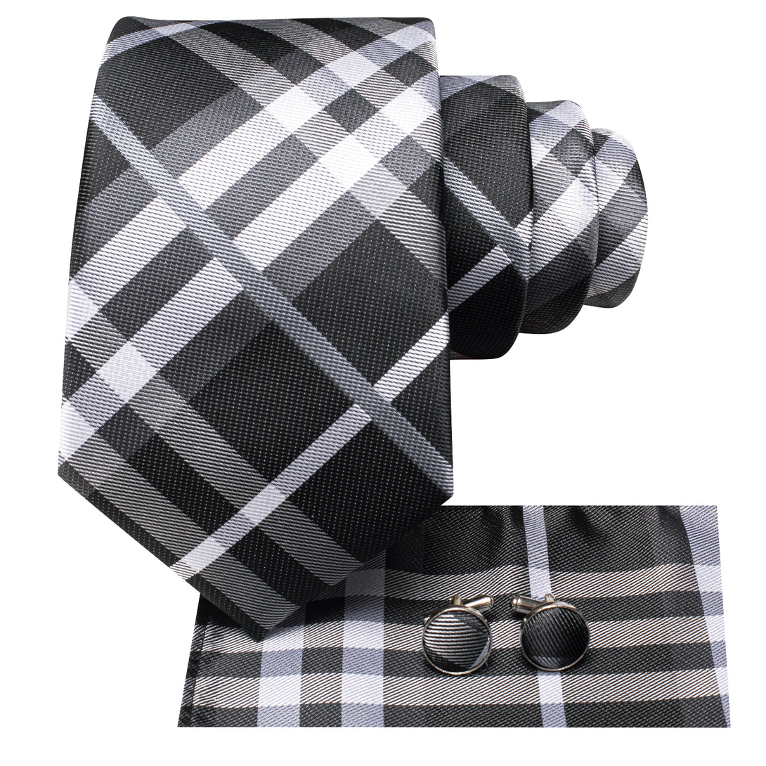 Grey White Plaid Silk Men's Tie Hanky Cufflinks Set