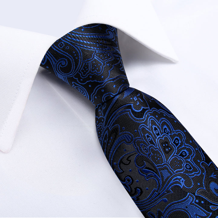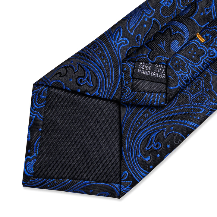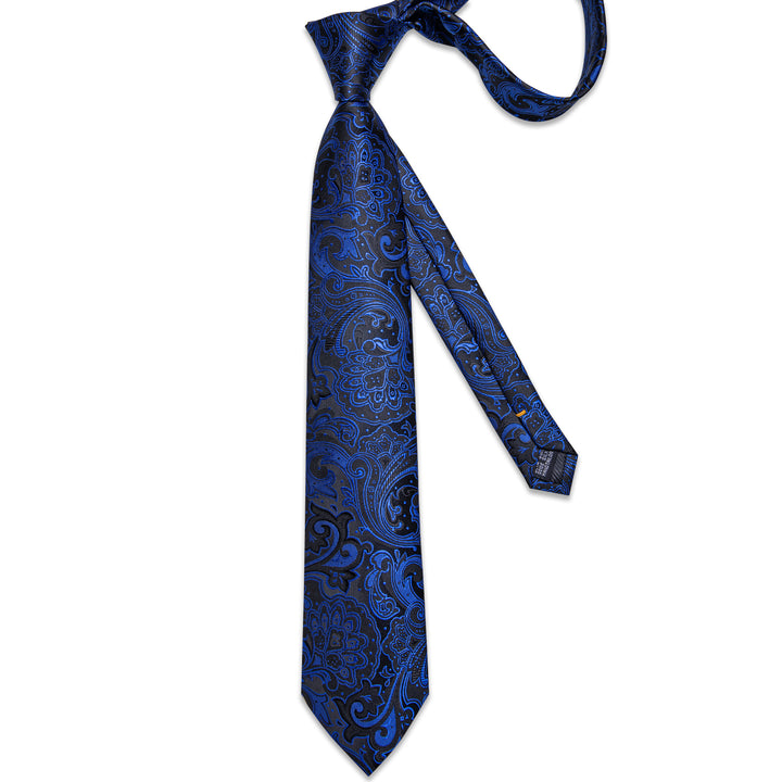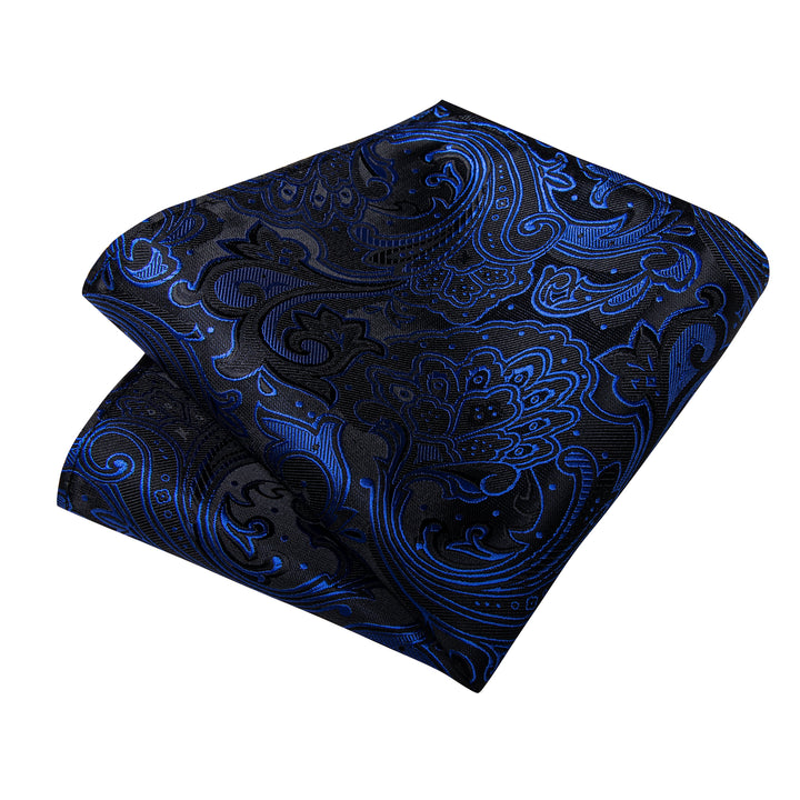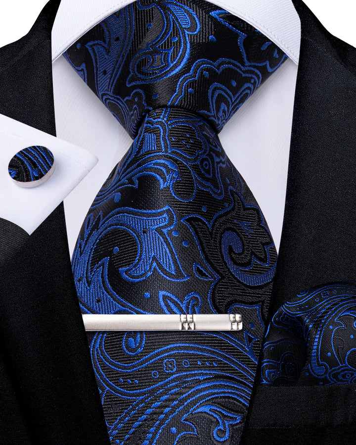 Klein Blue Black Paisley Silk Men's Necktie Pocket Square Cufflinks Set with Clip