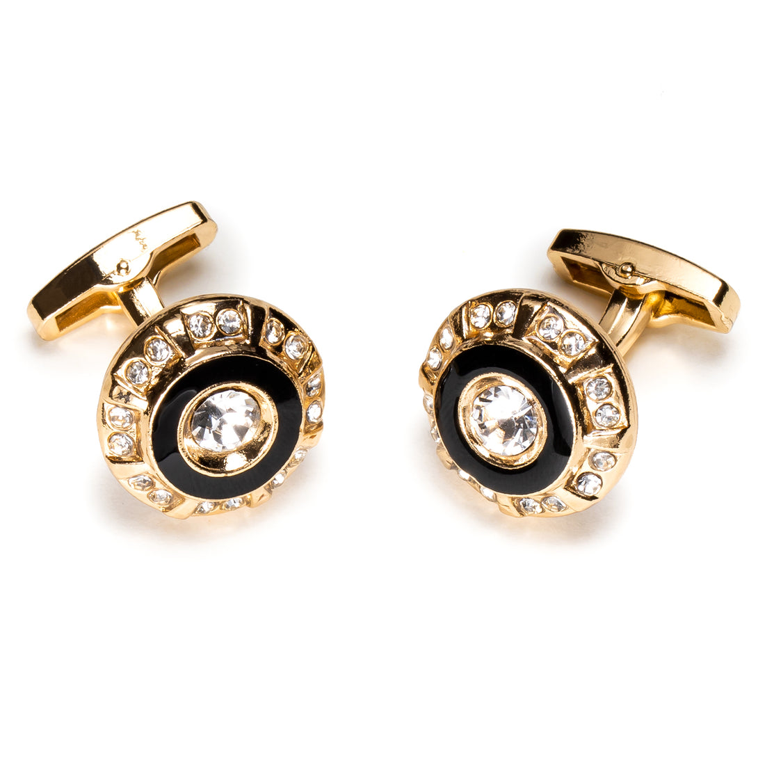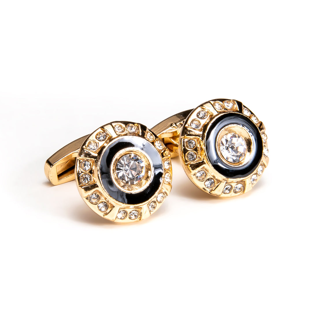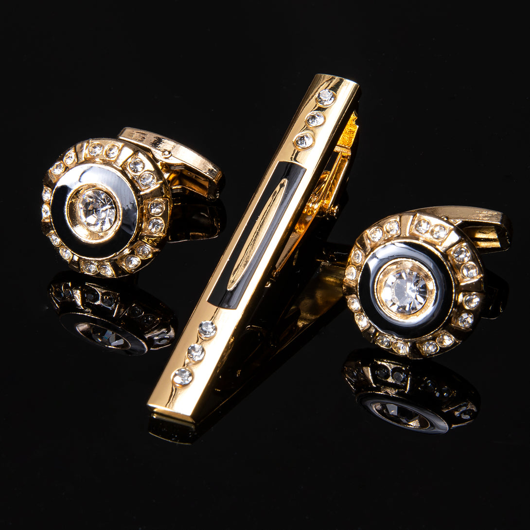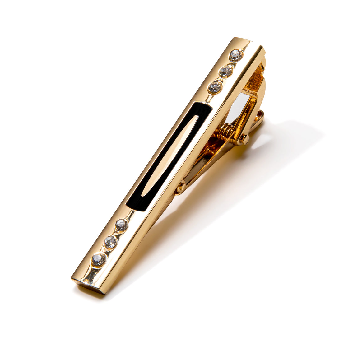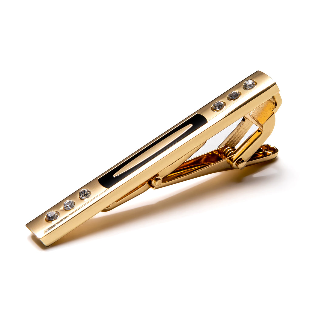 Lacquered Metal Golden with Little White Imitated Crystal Striped Tie Clip Cufflinks Set