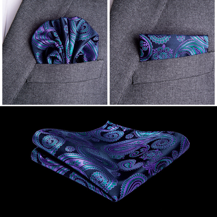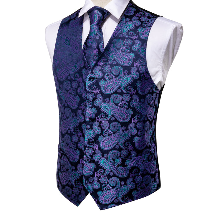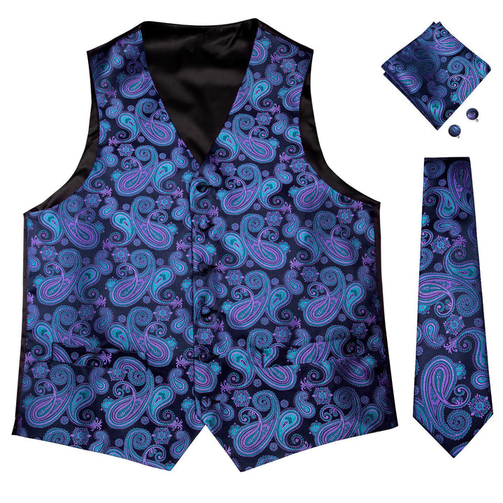 Luxury Blue Purple Paisley Jacquard Silk Men's Vest Hanky Cufflinks Tie Set Waistcoat Suit Set