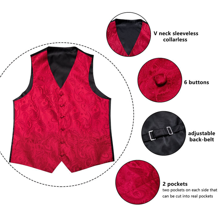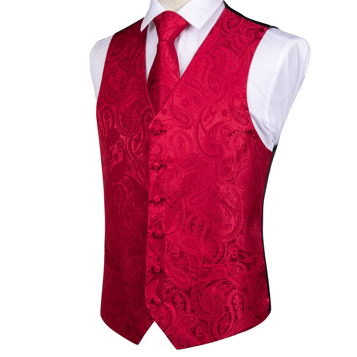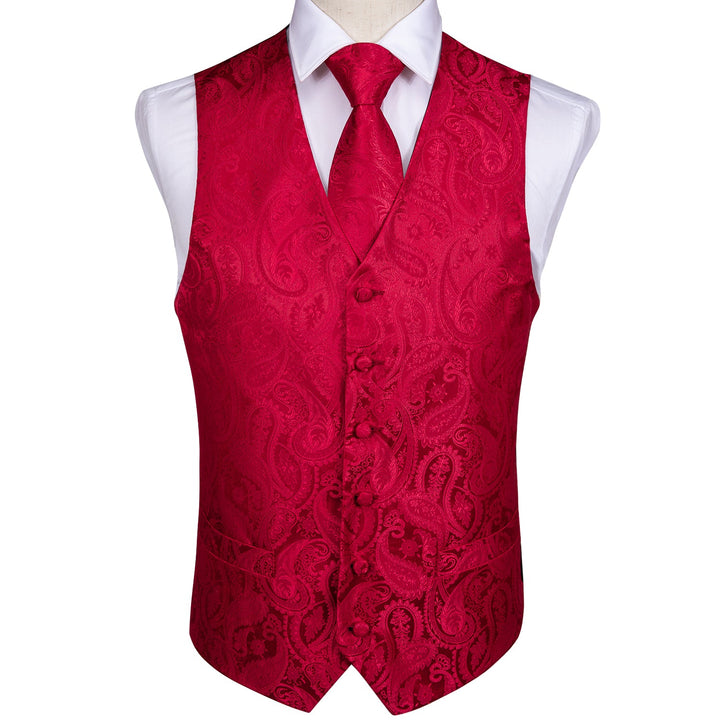 Luxury Red Paisley Jacquard Silk Men's Vest Hanky Cufflinks Tie Set Waistcoat Suit Set
