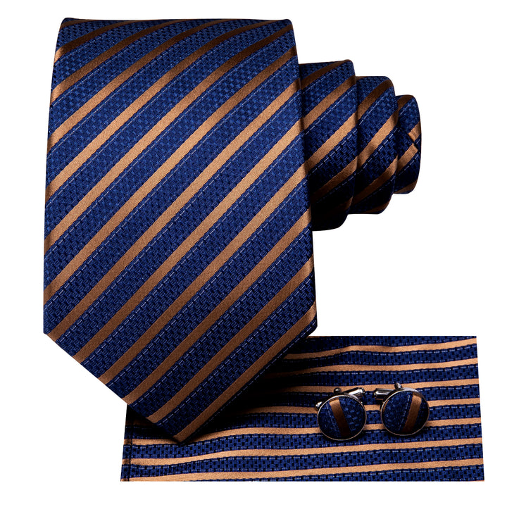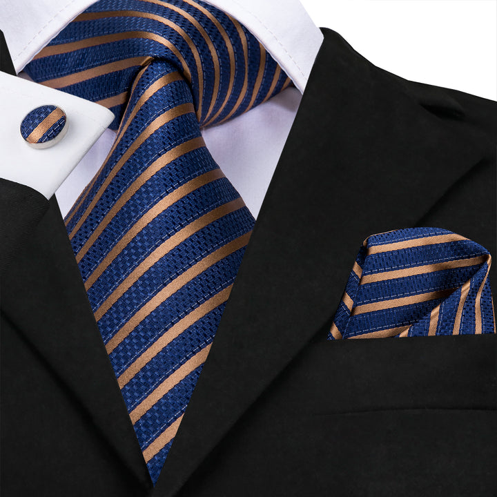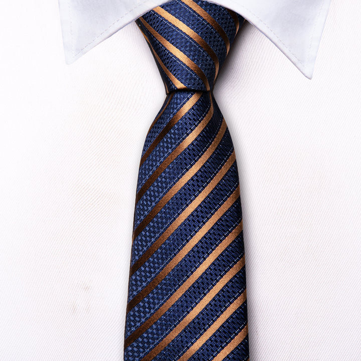 Navy Golden Striped 63 Inches Extra Long Tie Pocket Square Cufflinks Set