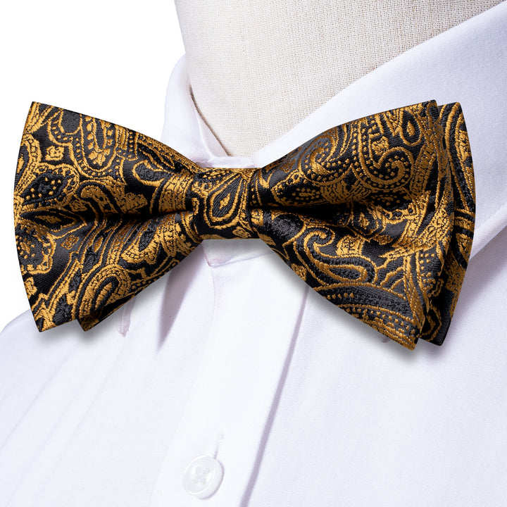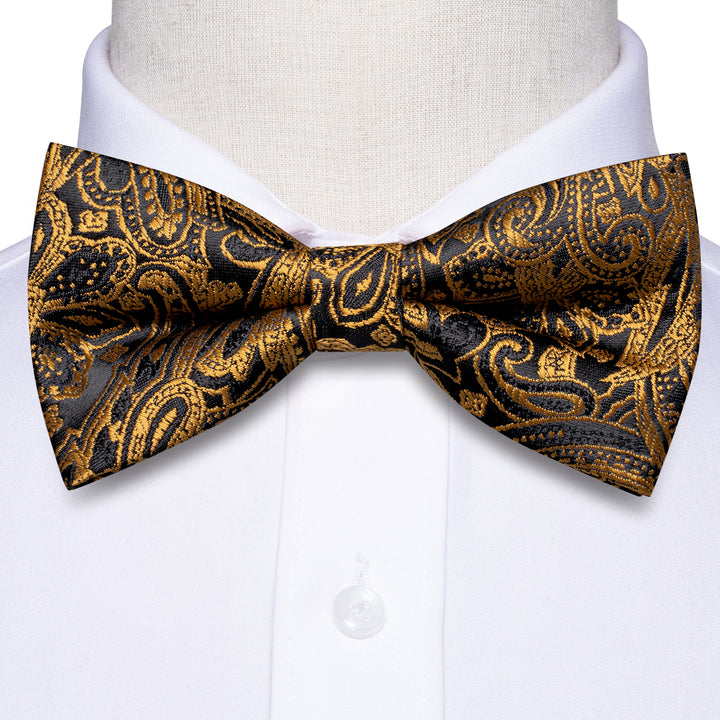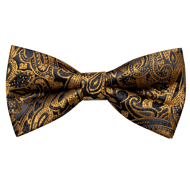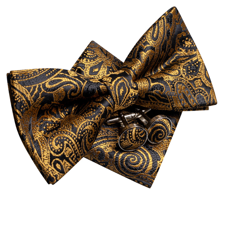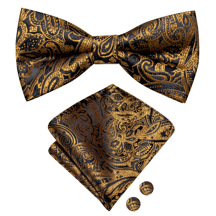 Black Golden Paisley Pre-tied Bow Tie Pocket Square Cufflinks Set