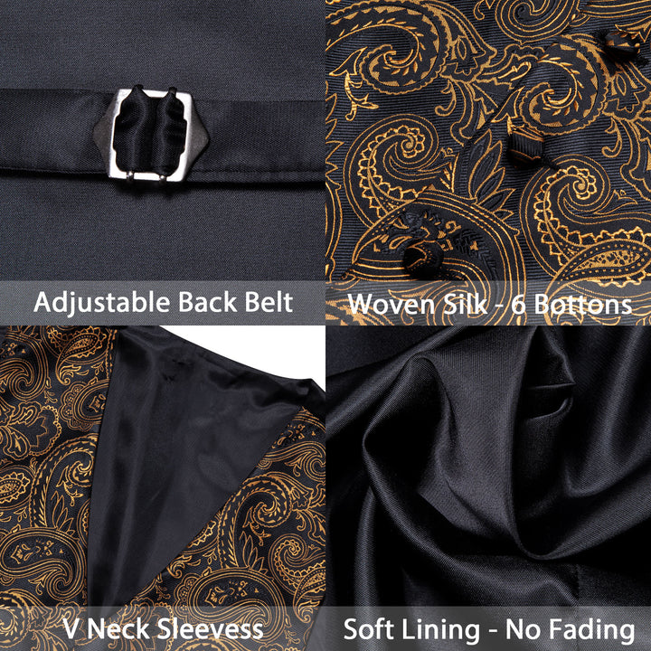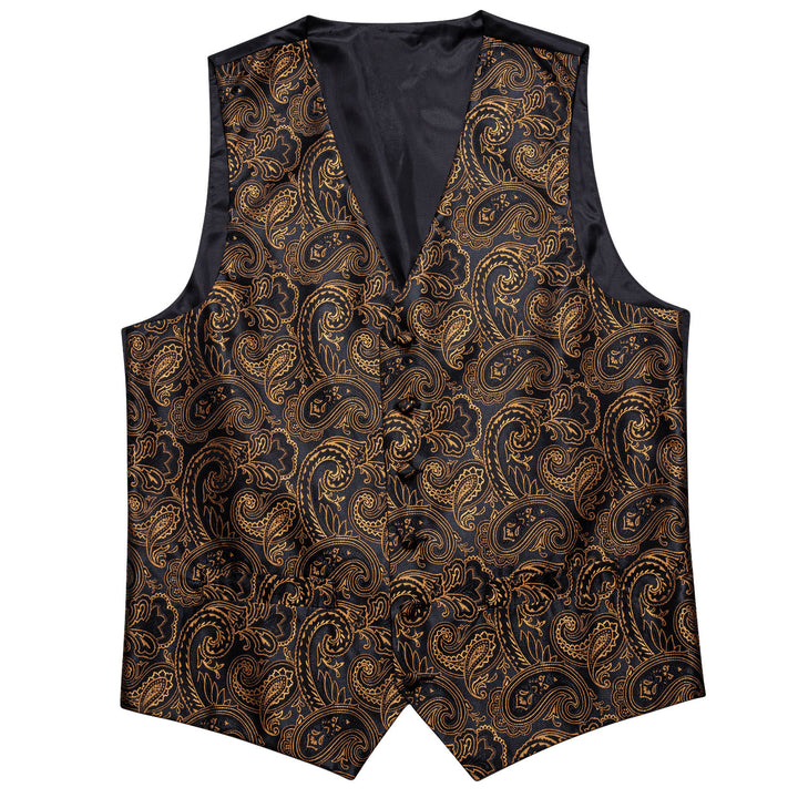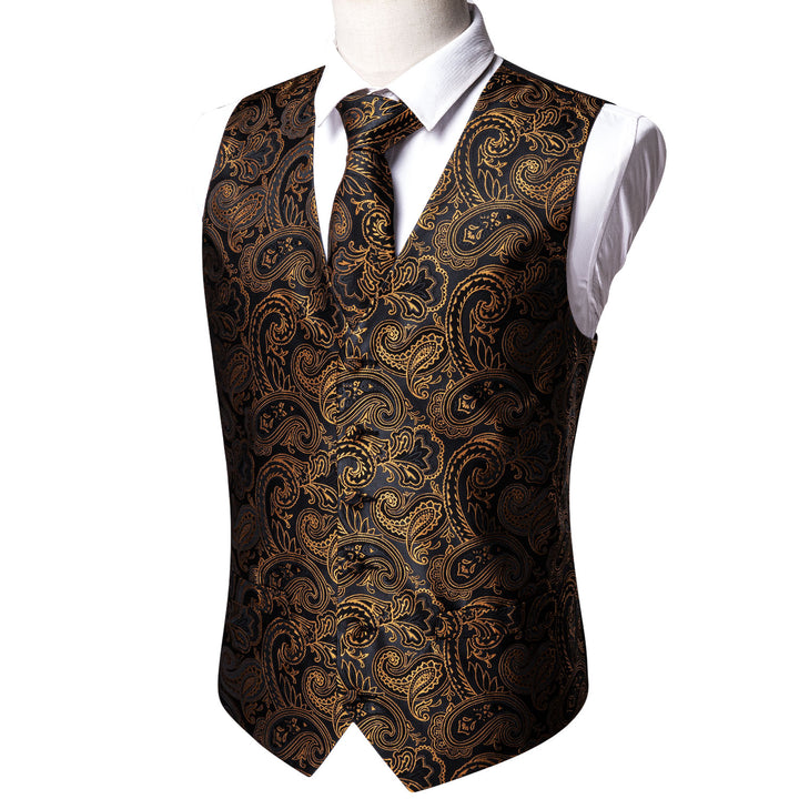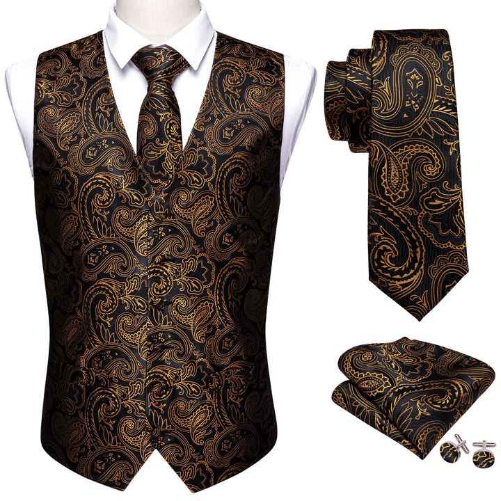 Black Golden Paisley Silk Men's Vest Tie Hanky Cufflinks Set Waistcoat Suit Set