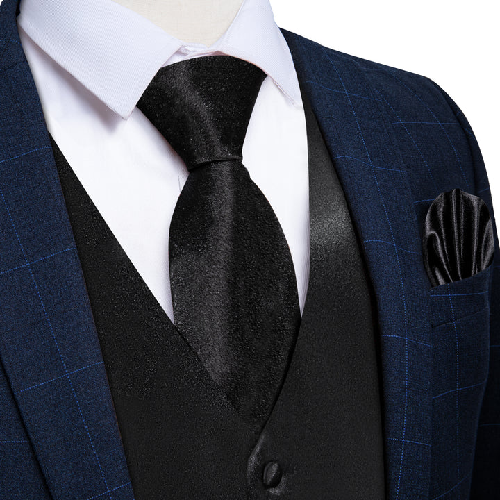 Black Solid Shining Silk Formal Men's Vest Hanky Cufflinks Tie Set