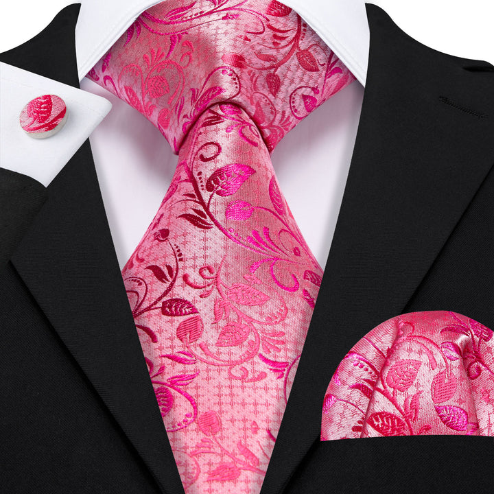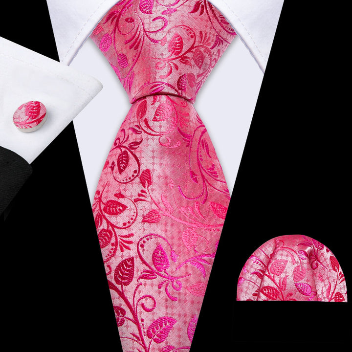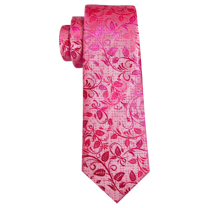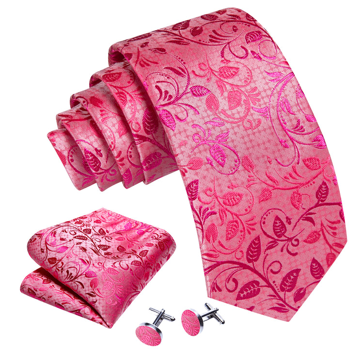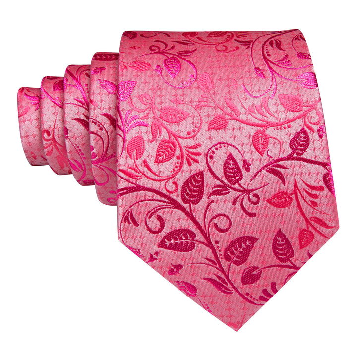 PaleVioletRed Leaves Floral Men's Necktie Pocket Square Cufflinks Set