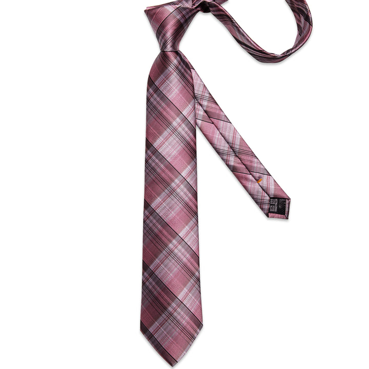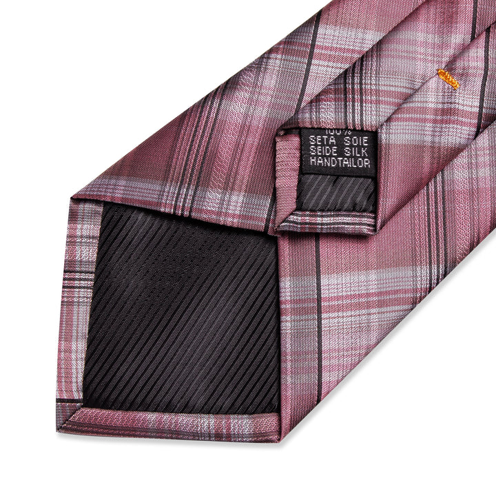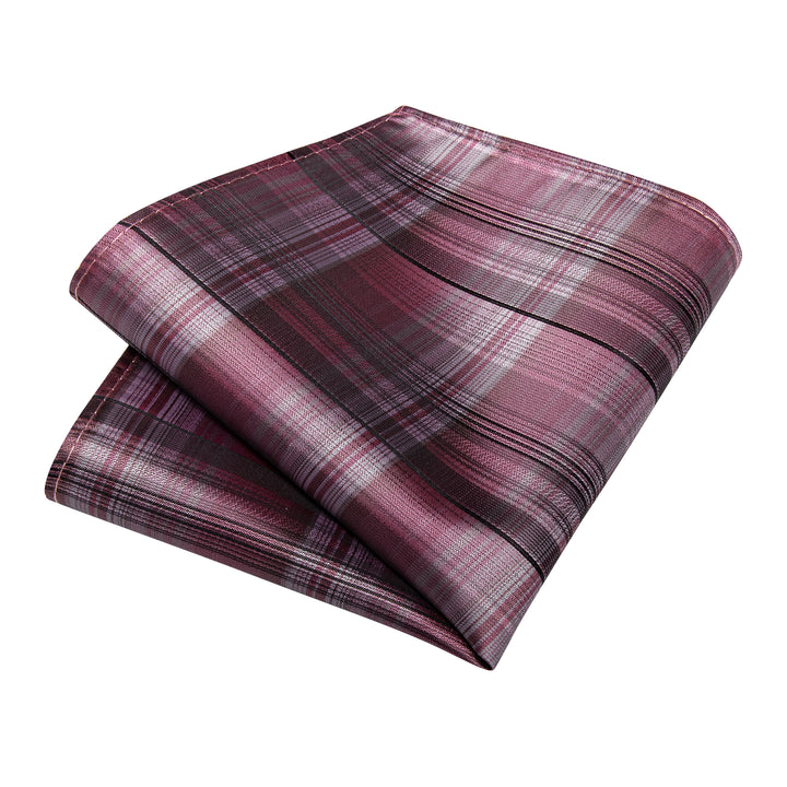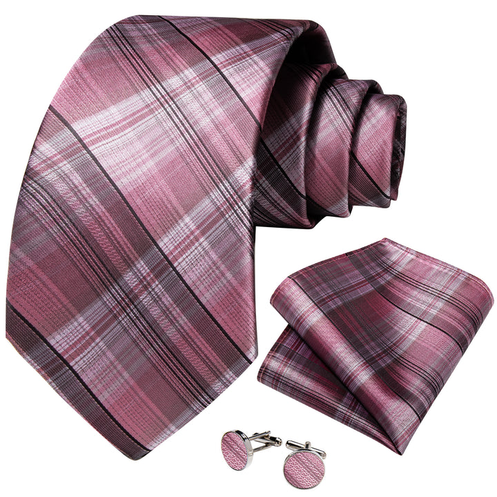 Pink Black Line Plaid Silk Fabric Tie Hanky Cufflinks Set
