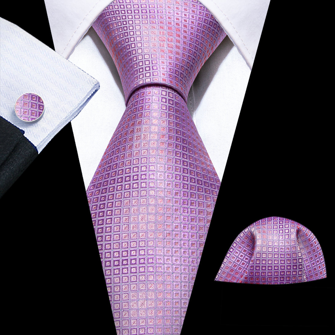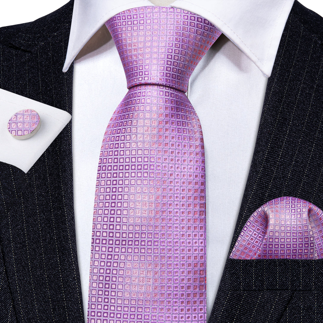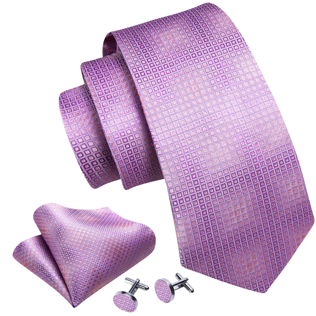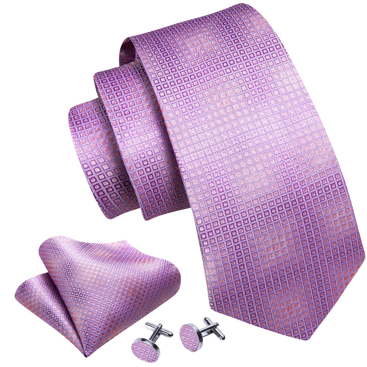 Purple Pink Gradient Plaid Silk Men's Necktie Pocket Square Cufflinks Set