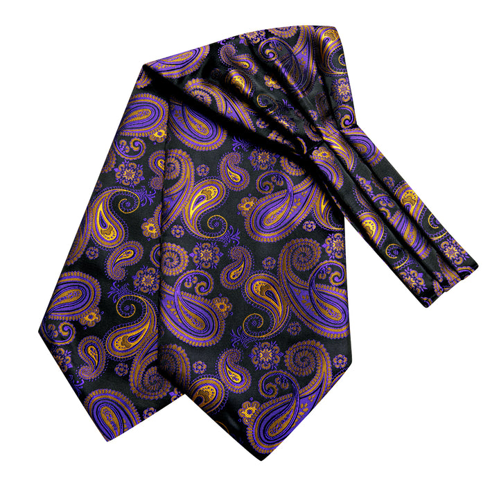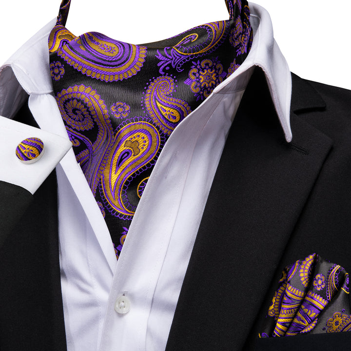 Purple Yellow Paisley Silk Cravat Woven Ascot Tie Pocket Square Cufflinks Set