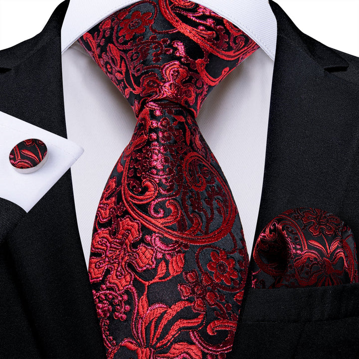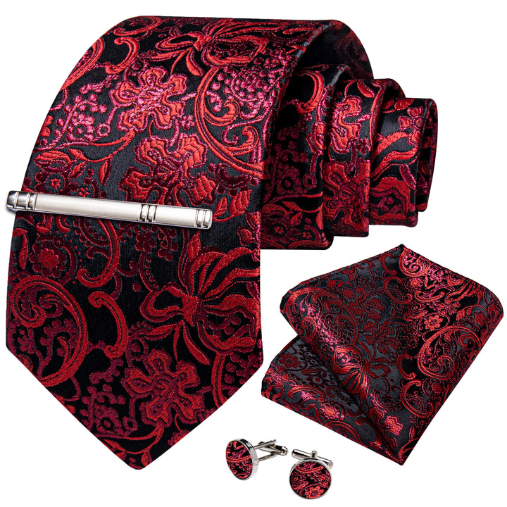 Red Black Floral Silk Men's Necktie Pocket Square Cufflinks Set with Clip