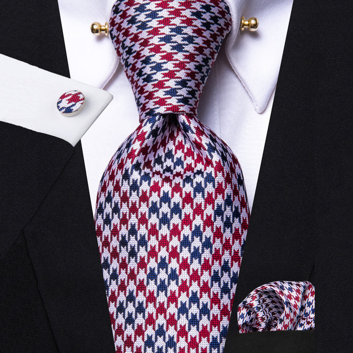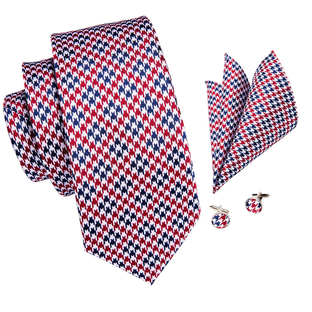 Red Blue Houndstooth Plaid Men's Tie Hanky Cufflinks Set with Collar Pin
