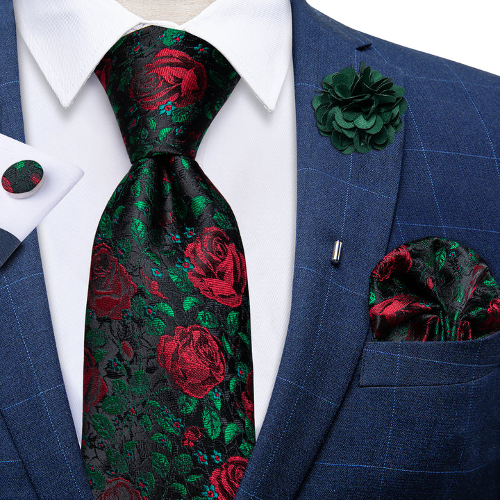 Red Rose Green Black Floral Men's Necktie Pocket Square Cufflinks Set with Lapel Pin