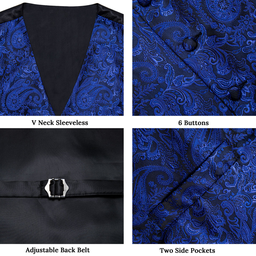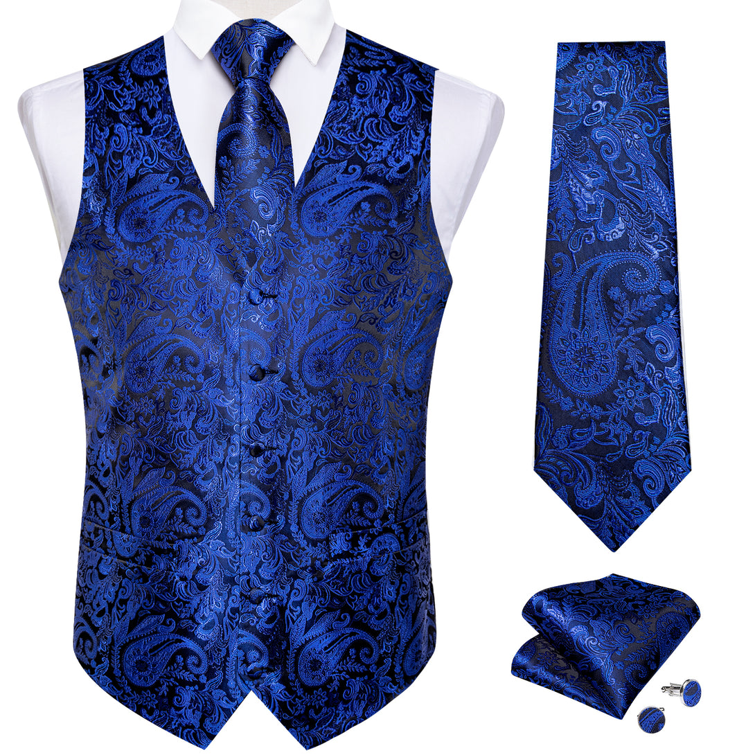 Royal Blue Paisley Silk Men's Vest Hanky Cufflinks Tie Set