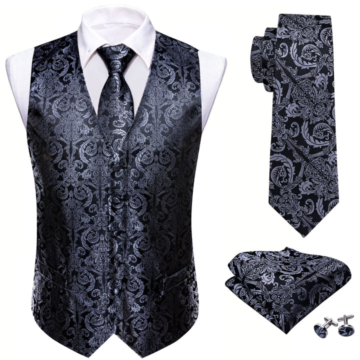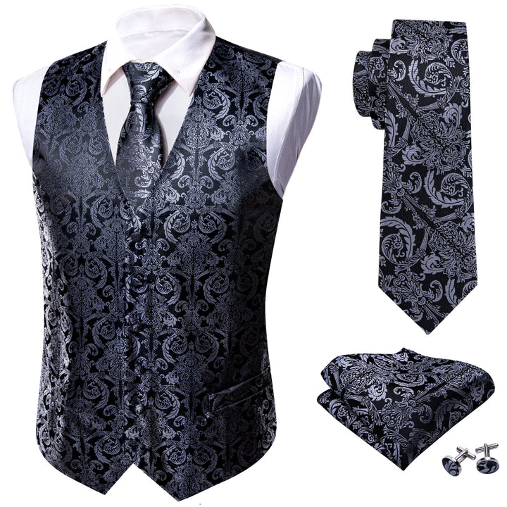 Silver Black Floral Jacquard Silk Men's Vest Hanky Cufflinks Tie Set