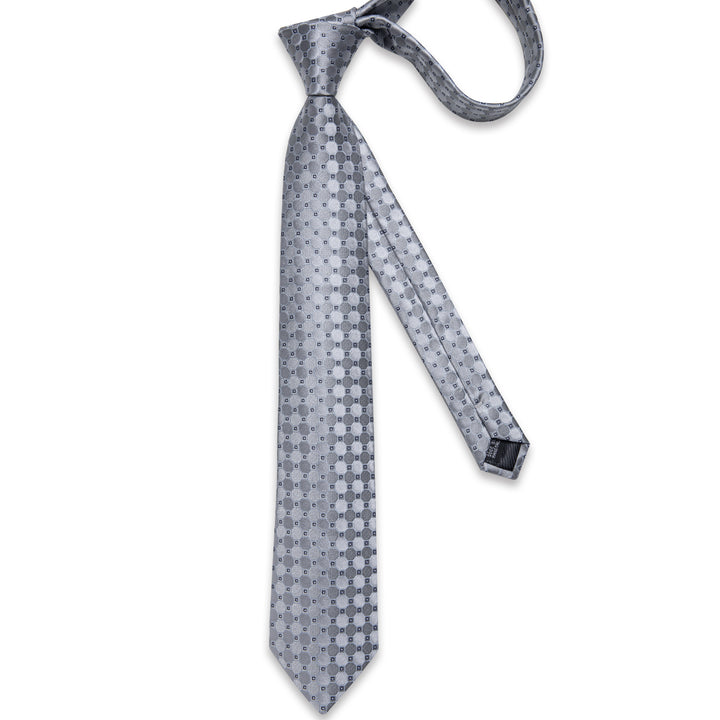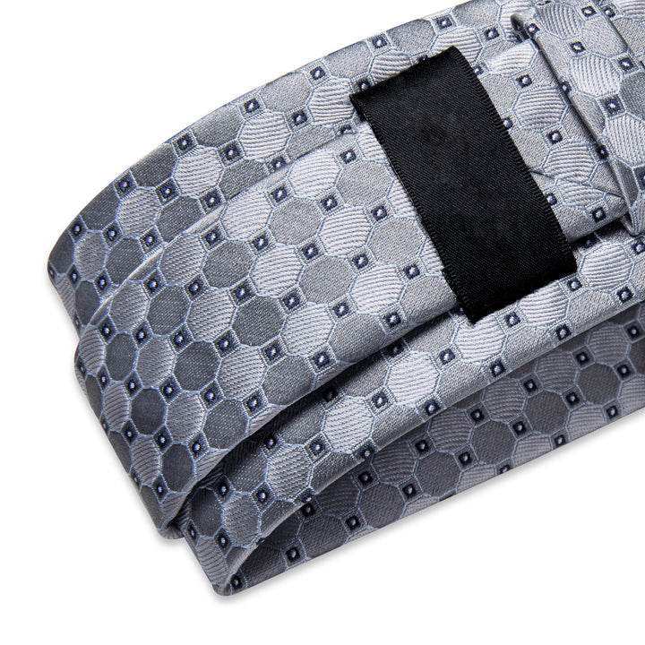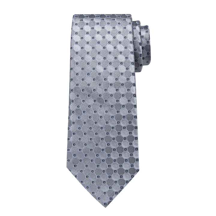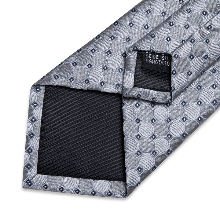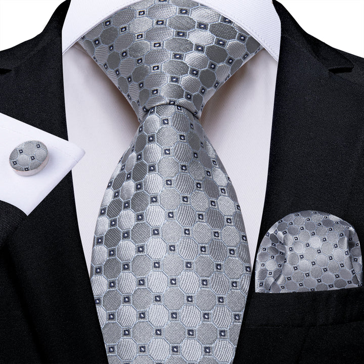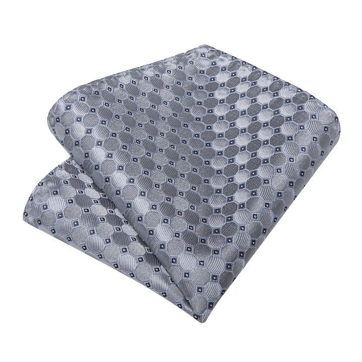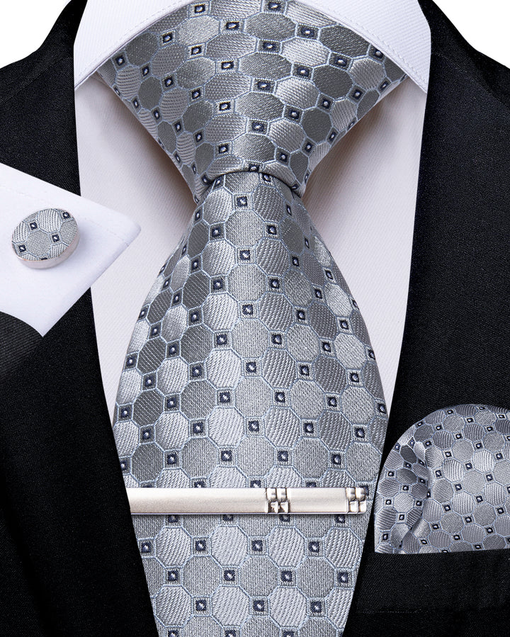 Silver Black Geometric Silk Men's Necktie Pocket Square Cufflinks Set with Clip