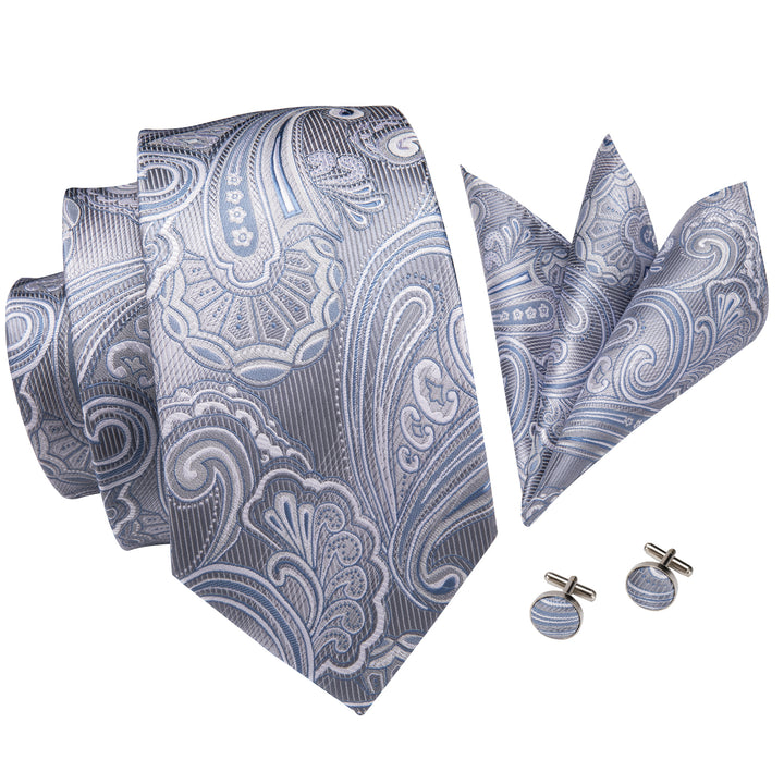 Silver Blue Paisley Men's Necktie Pocket Square Cufflinks Set