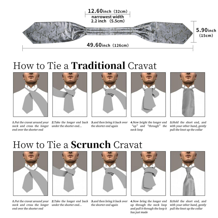Regular Size: Ascot: 6.1" (15.5cm) wide, 2.17" (5.5cm) broad, 49.6" (126cm) length; Pocket Square: 9" x 9" (23cm x 23cm)