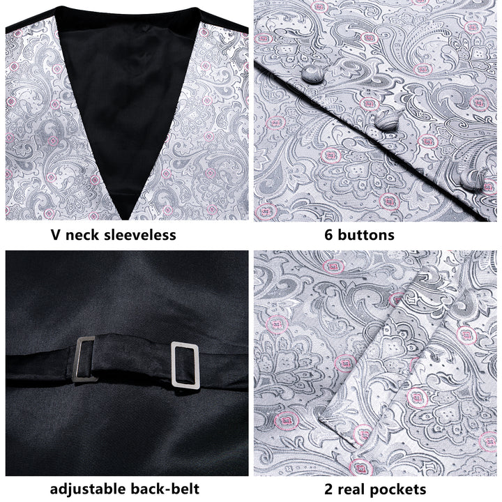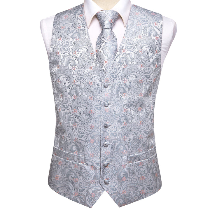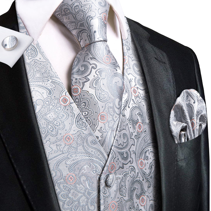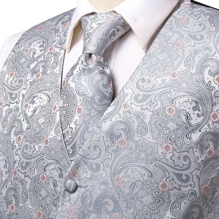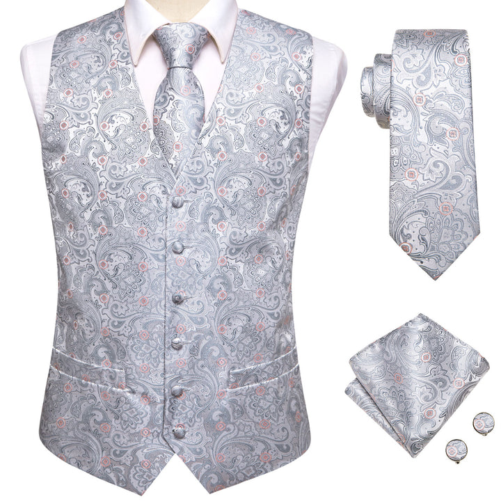 Silver Grey Paisley Floral Jacquard Silk Men's Vest Hanky Cufflinks Tie Set