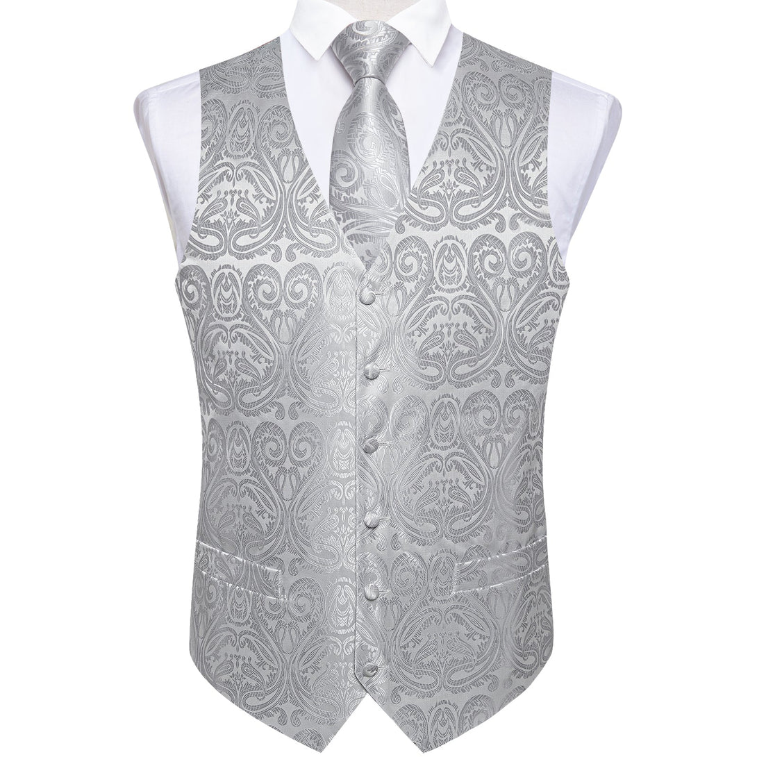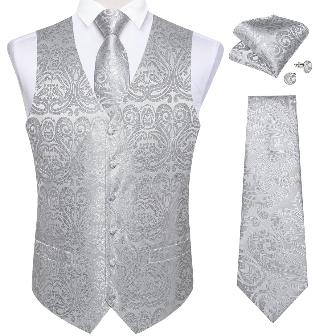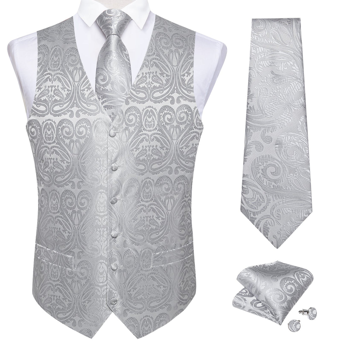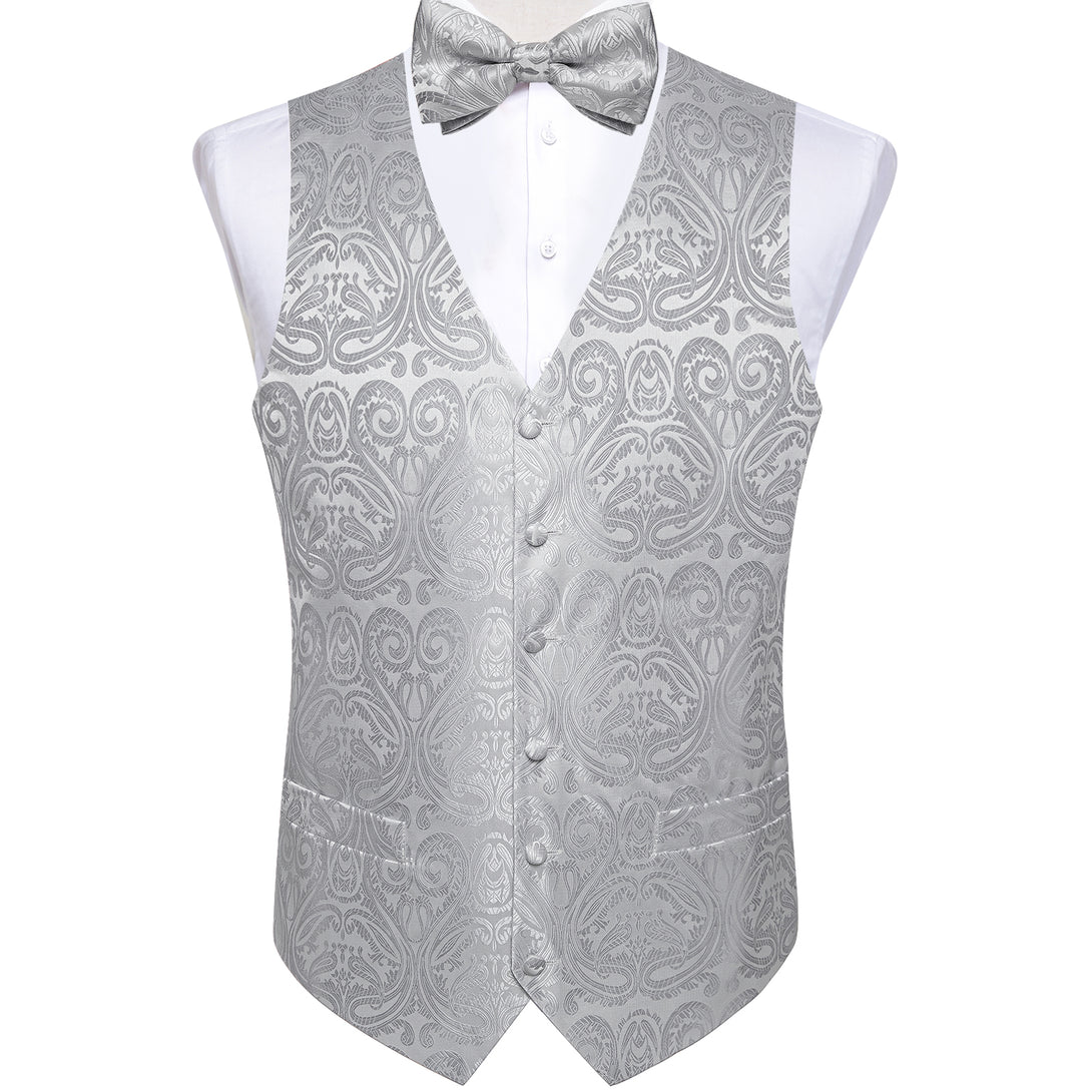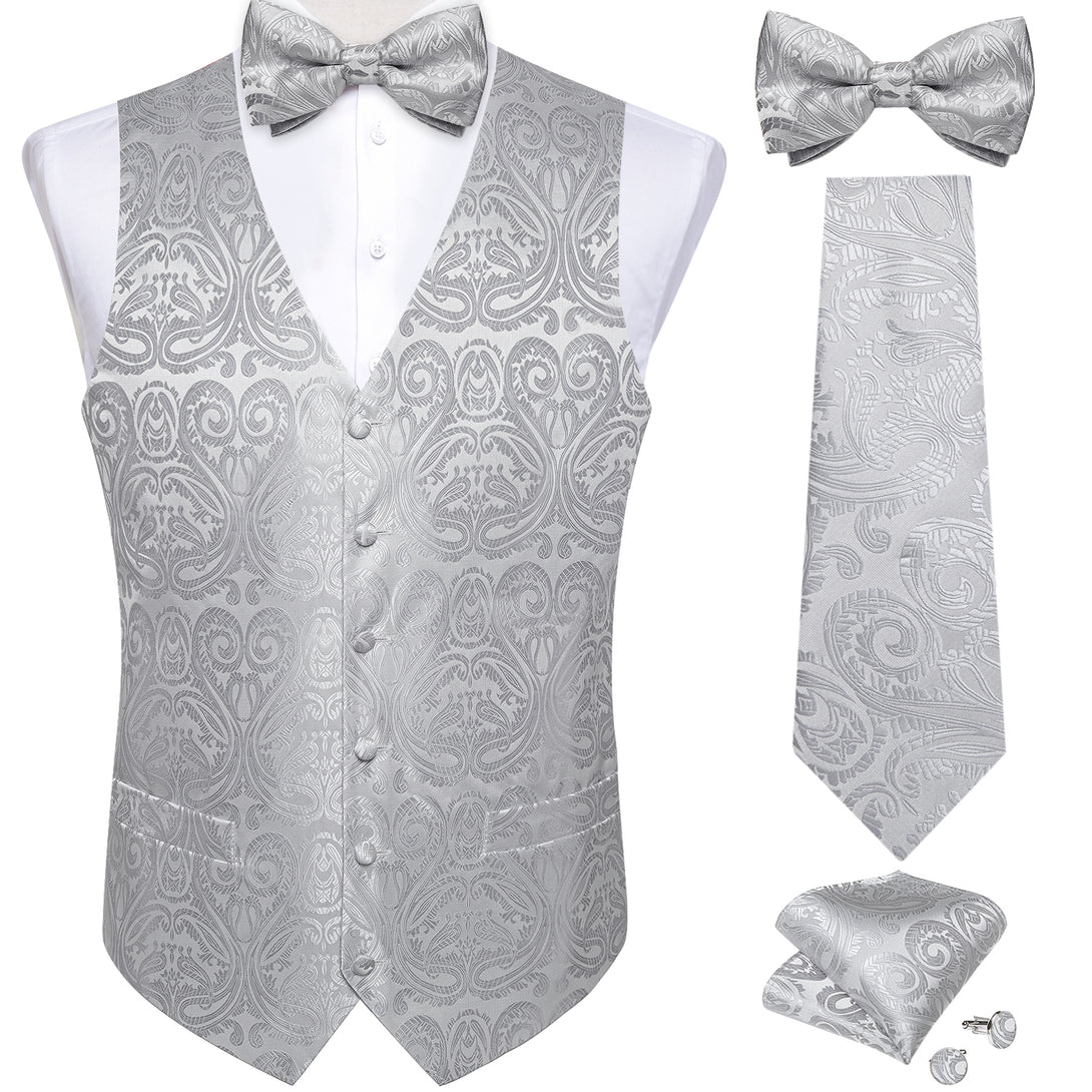 Silver Grey Paisley Jacquard Silk Men's Vest Hanky Cufflinks Necktie Bowtie Set