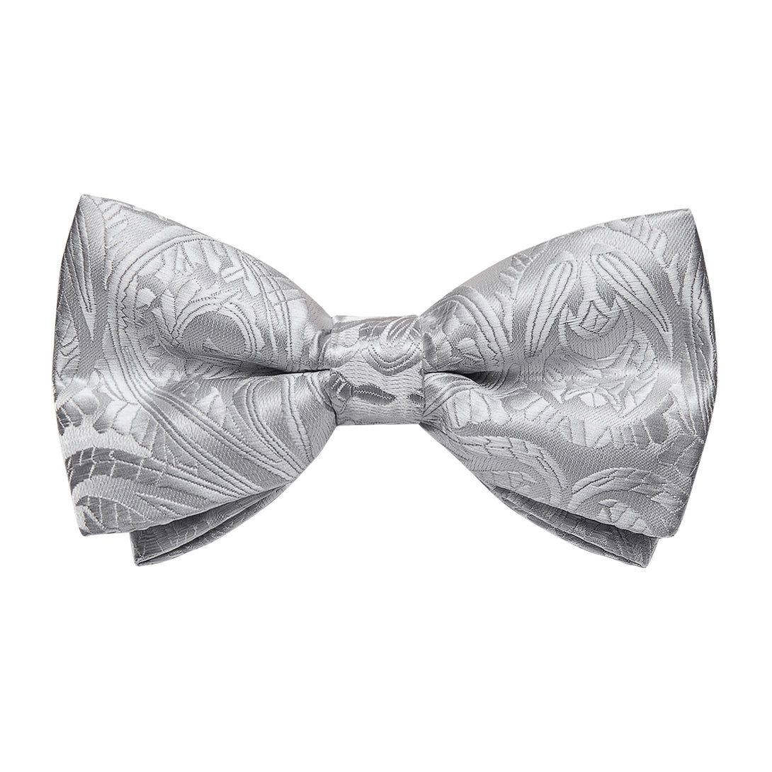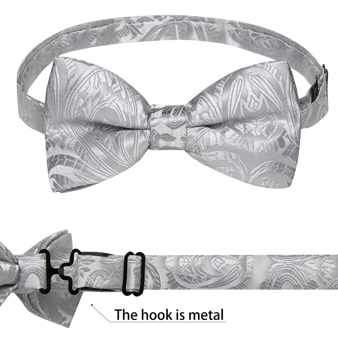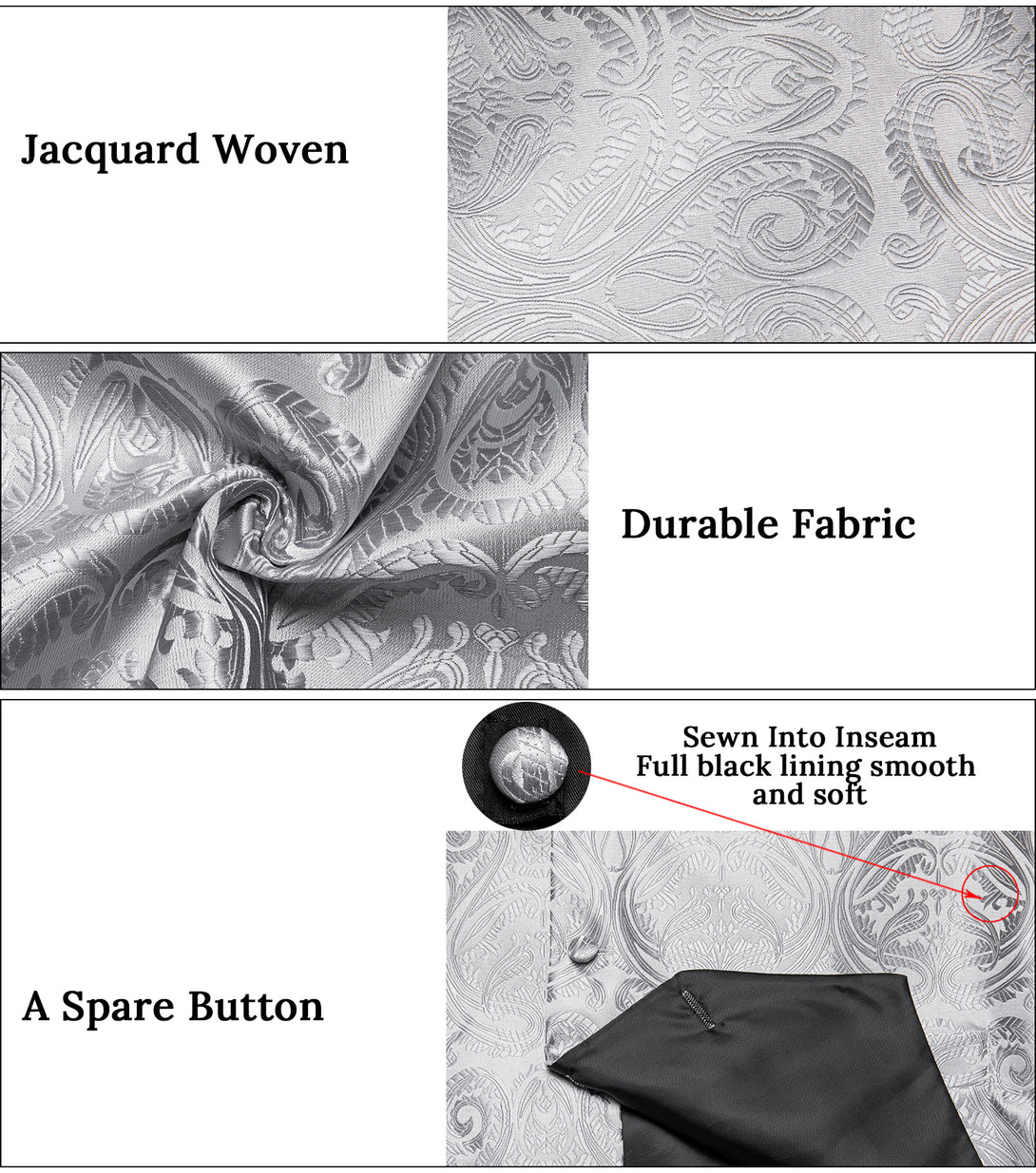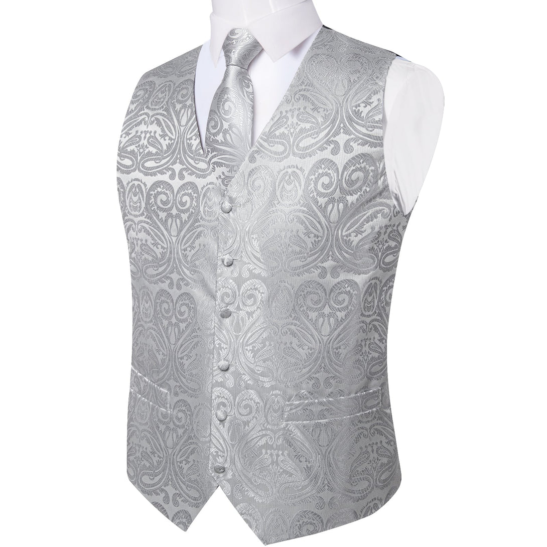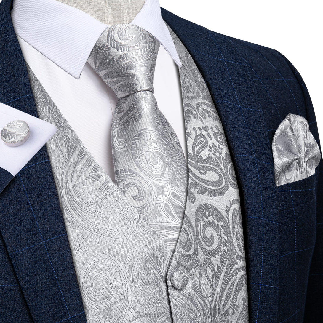 Silver Grey Paisley Jacquard Silk Men's Vest Hanky Cufflinks Necktie Bowtie Set