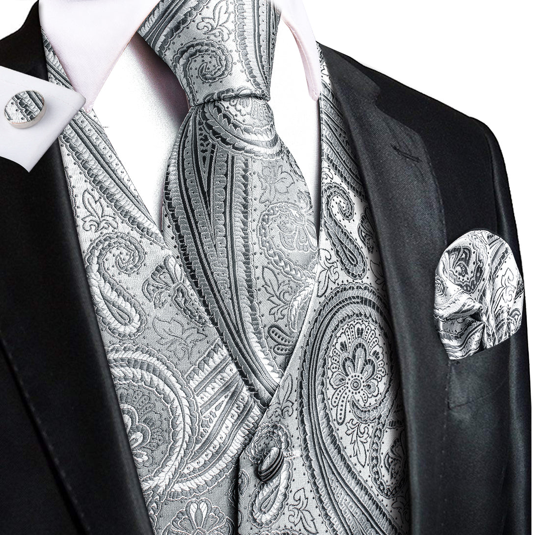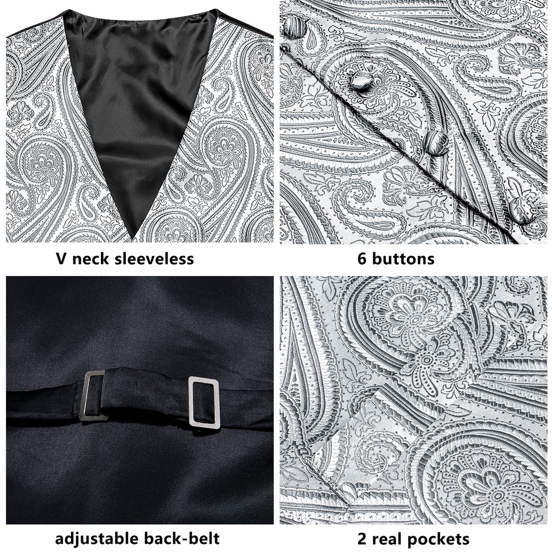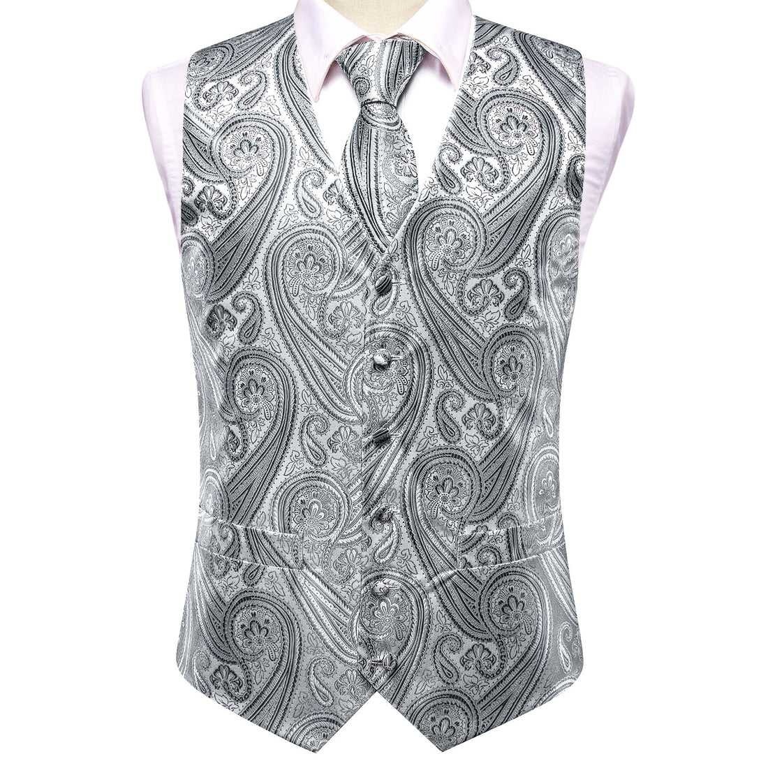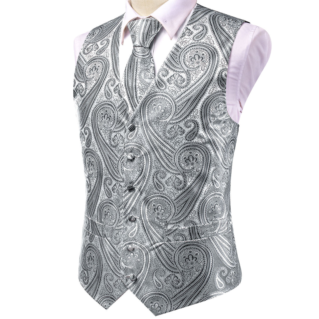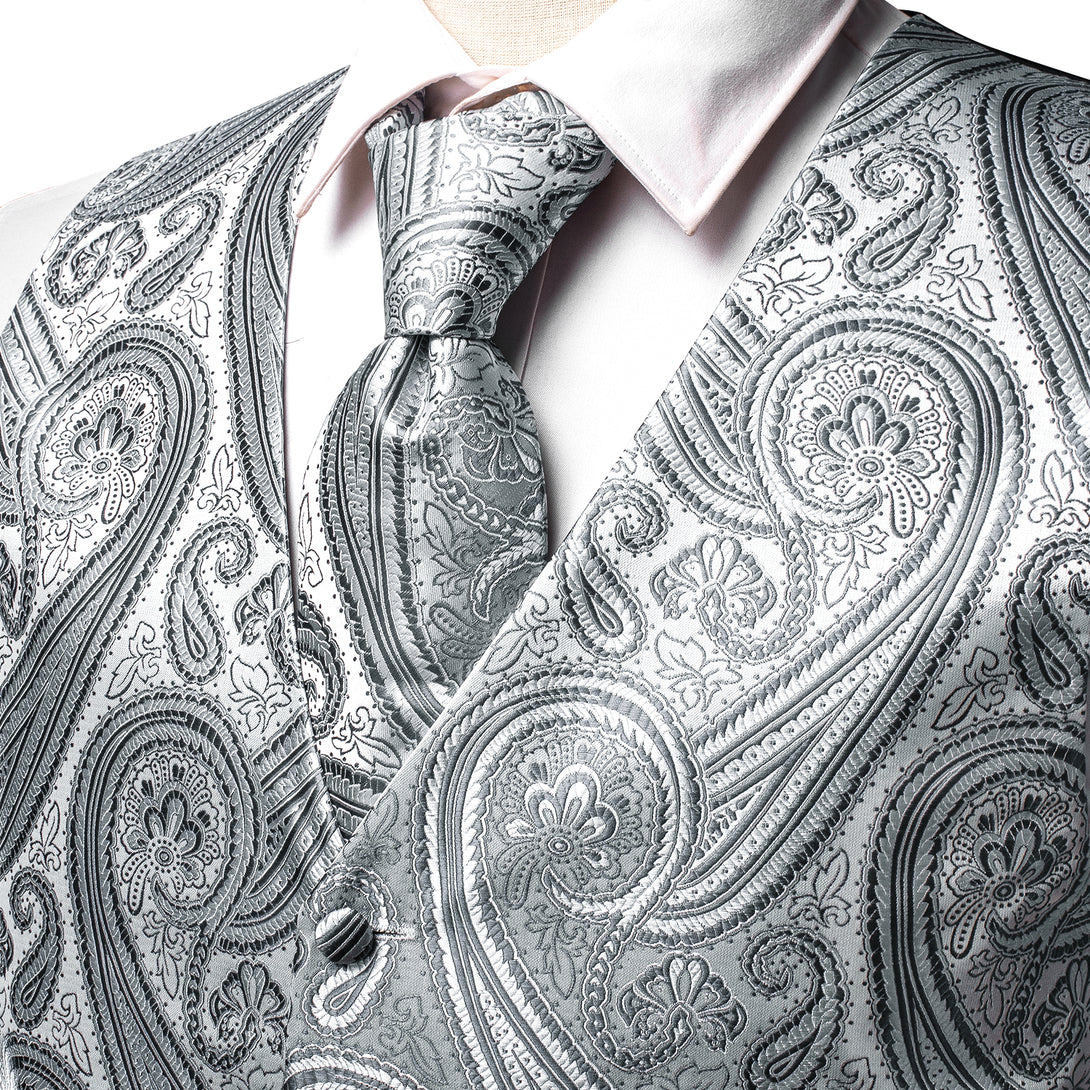 Silver Grey Paisley Jacquard Silk Men's Vest Hanky Cufflinks Tie Set