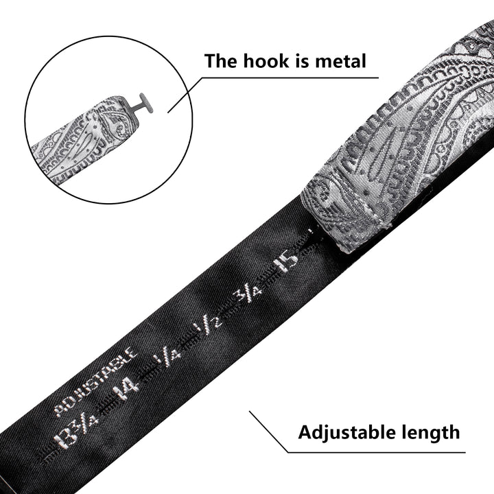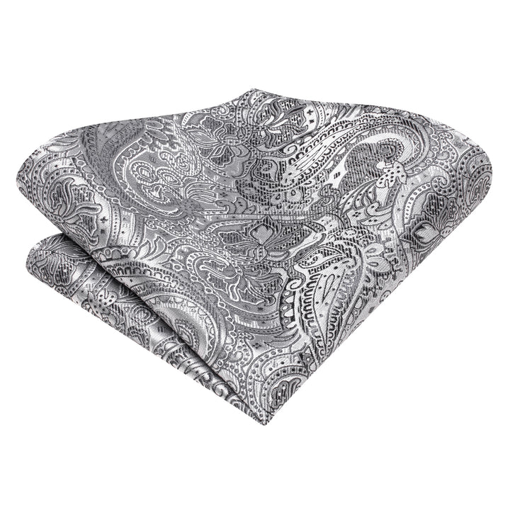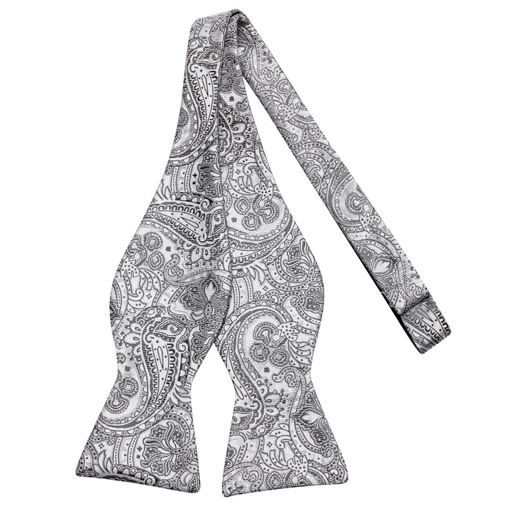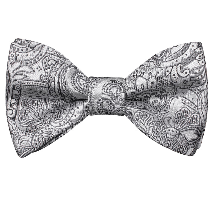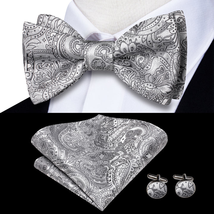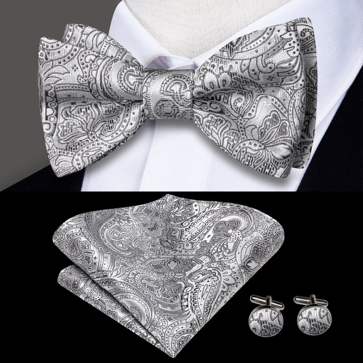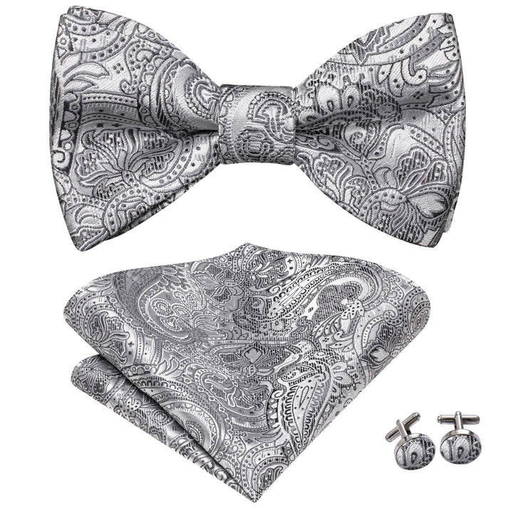 Silver Grey Paisley Self-tied Bow Tie Pocket Square Cufflinks Set