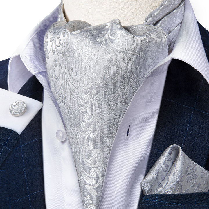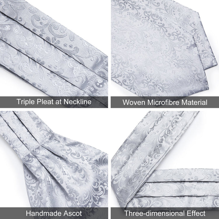 Silver Floral Silk Cravat Woven Ascot Tie Pocket Square Handkerchief Set