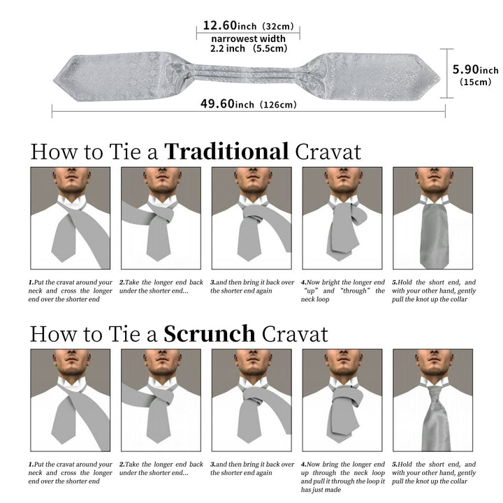 Regular Size: Ascot: 6.1" (15.5cm) wide, 2.17" (5.5cm) broad, 49.6" (126cm) length; Pocket Square: 9" x 9" (23cm x 23cm)