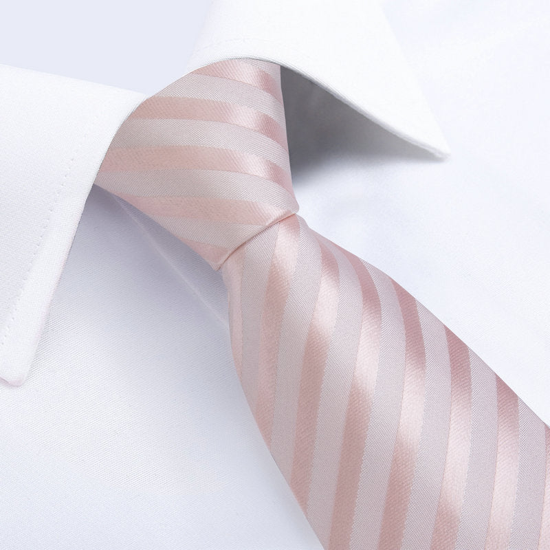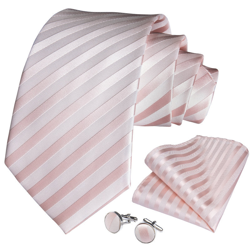 Silver Pink Striped Silk Fabric Tie Hanky Cufflinks Set 8cm